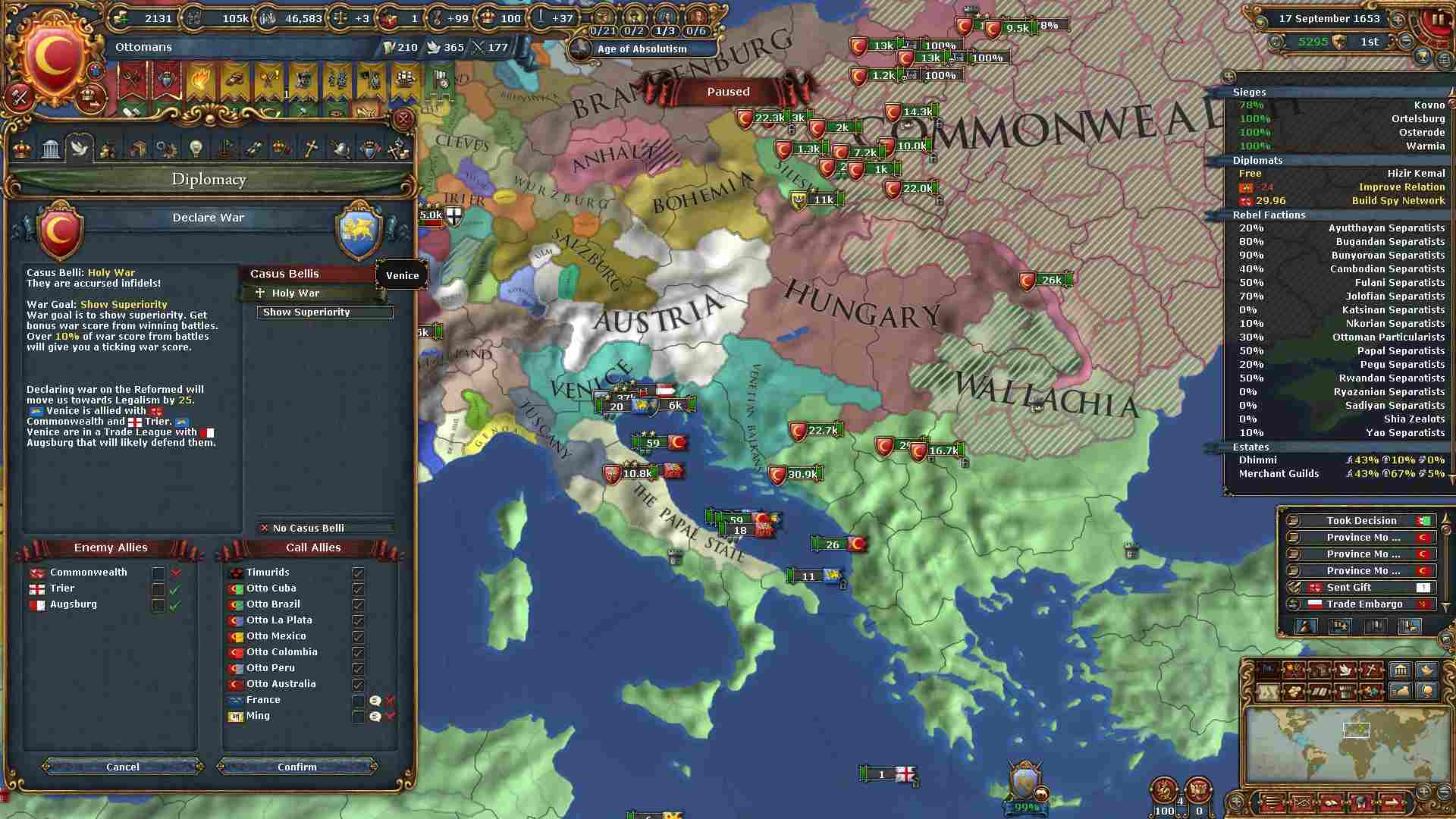 コモンウェルスと同盟を結ぶヴェニスに便乗で攻め込みます。