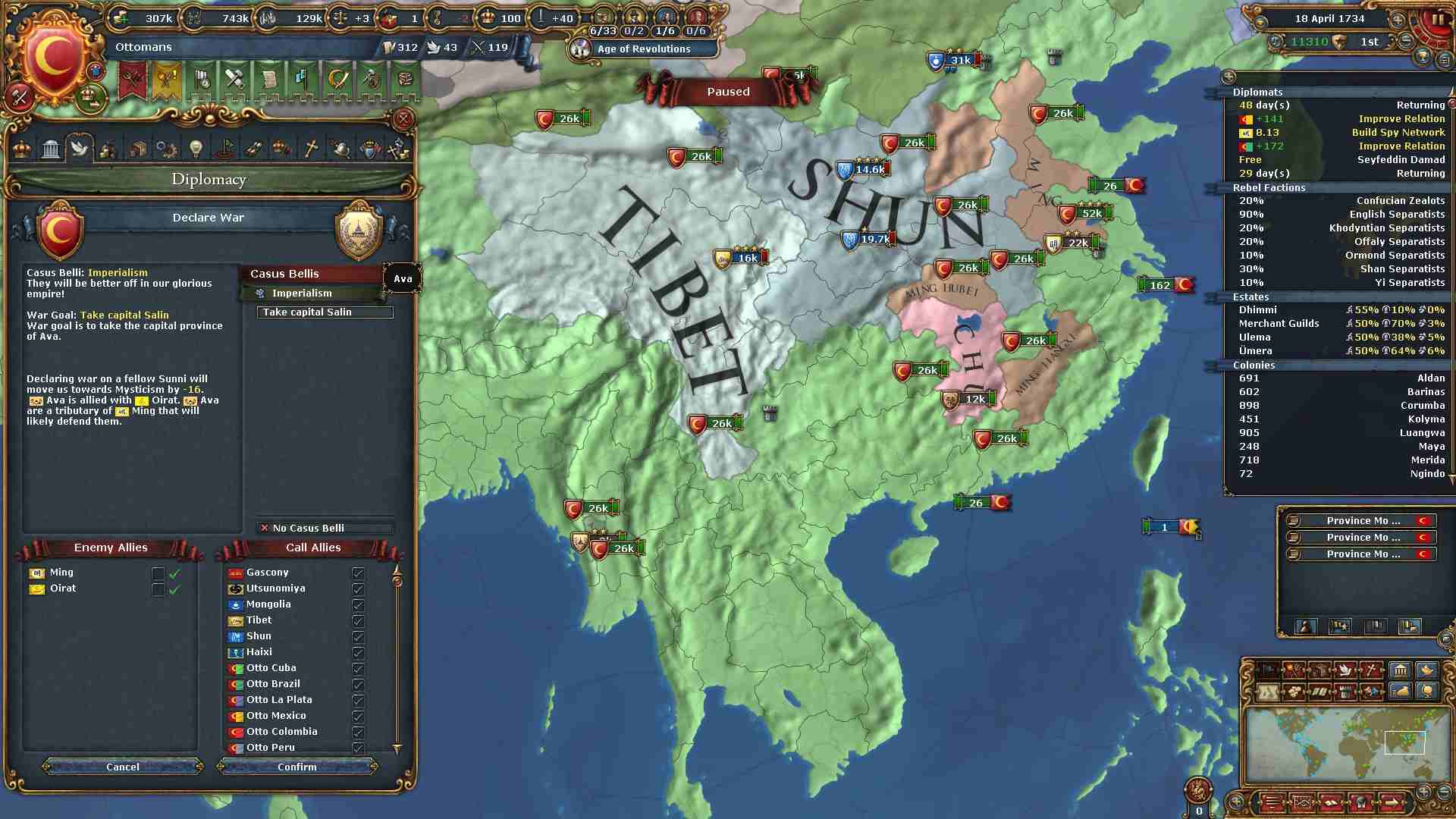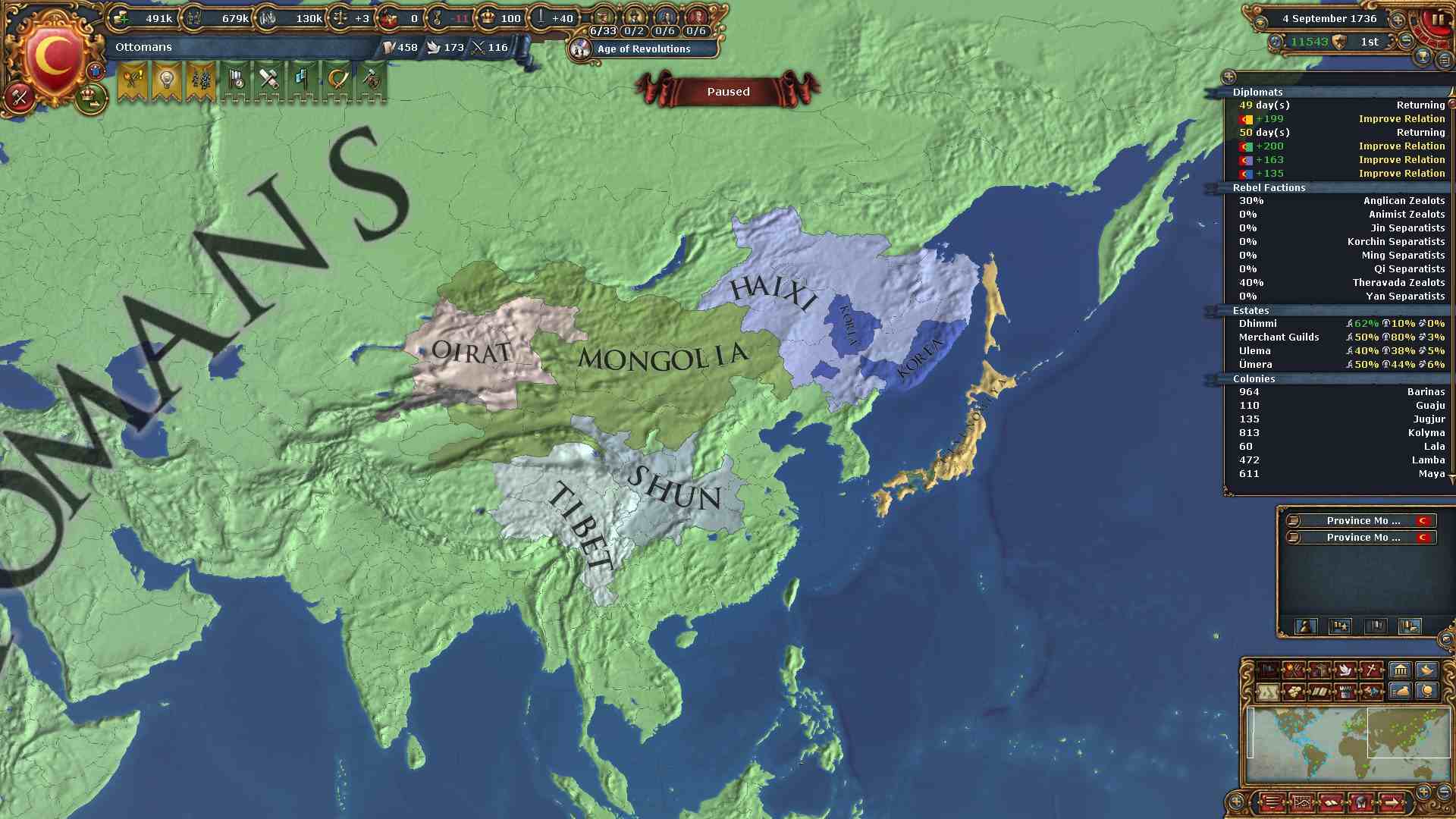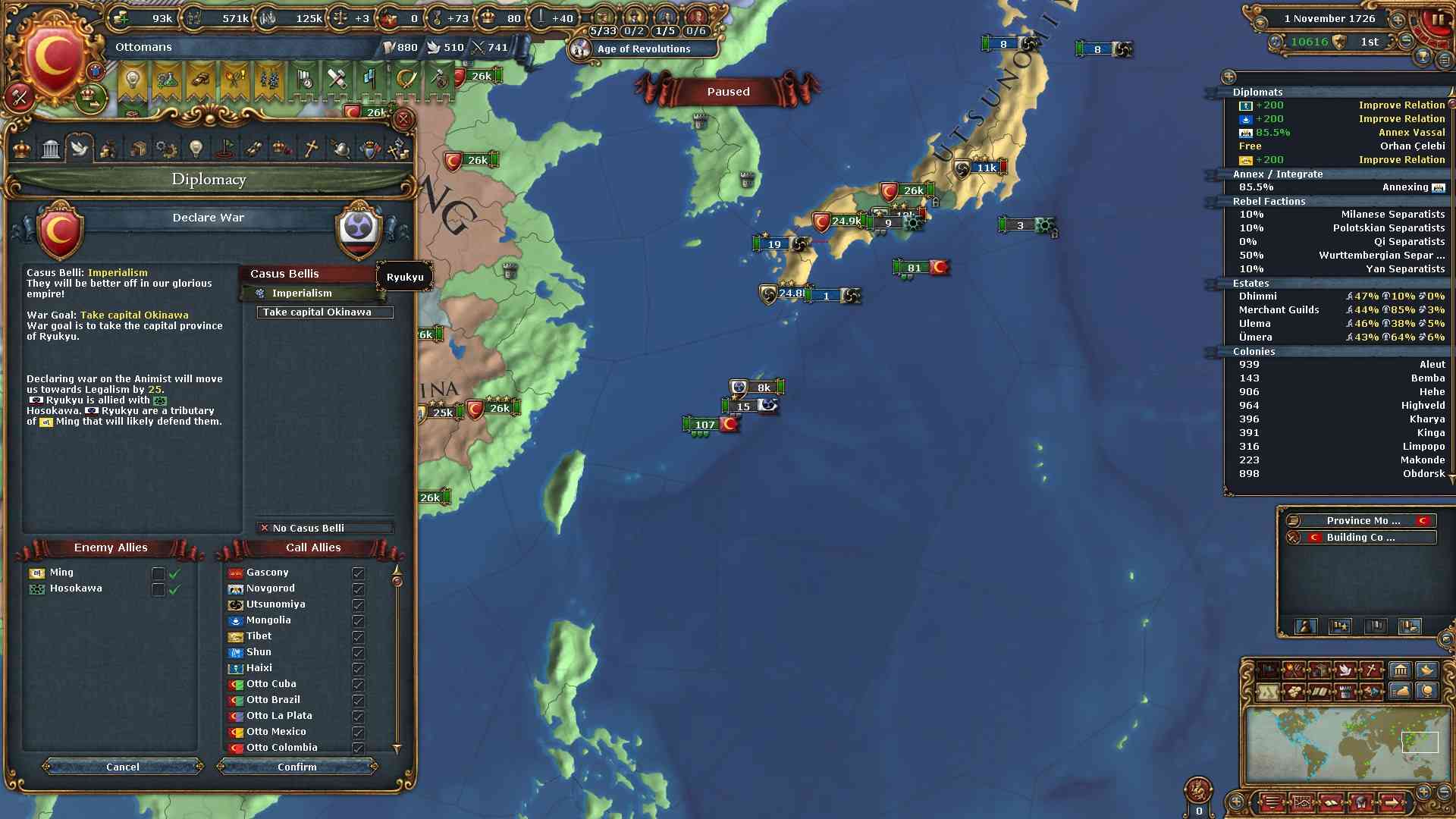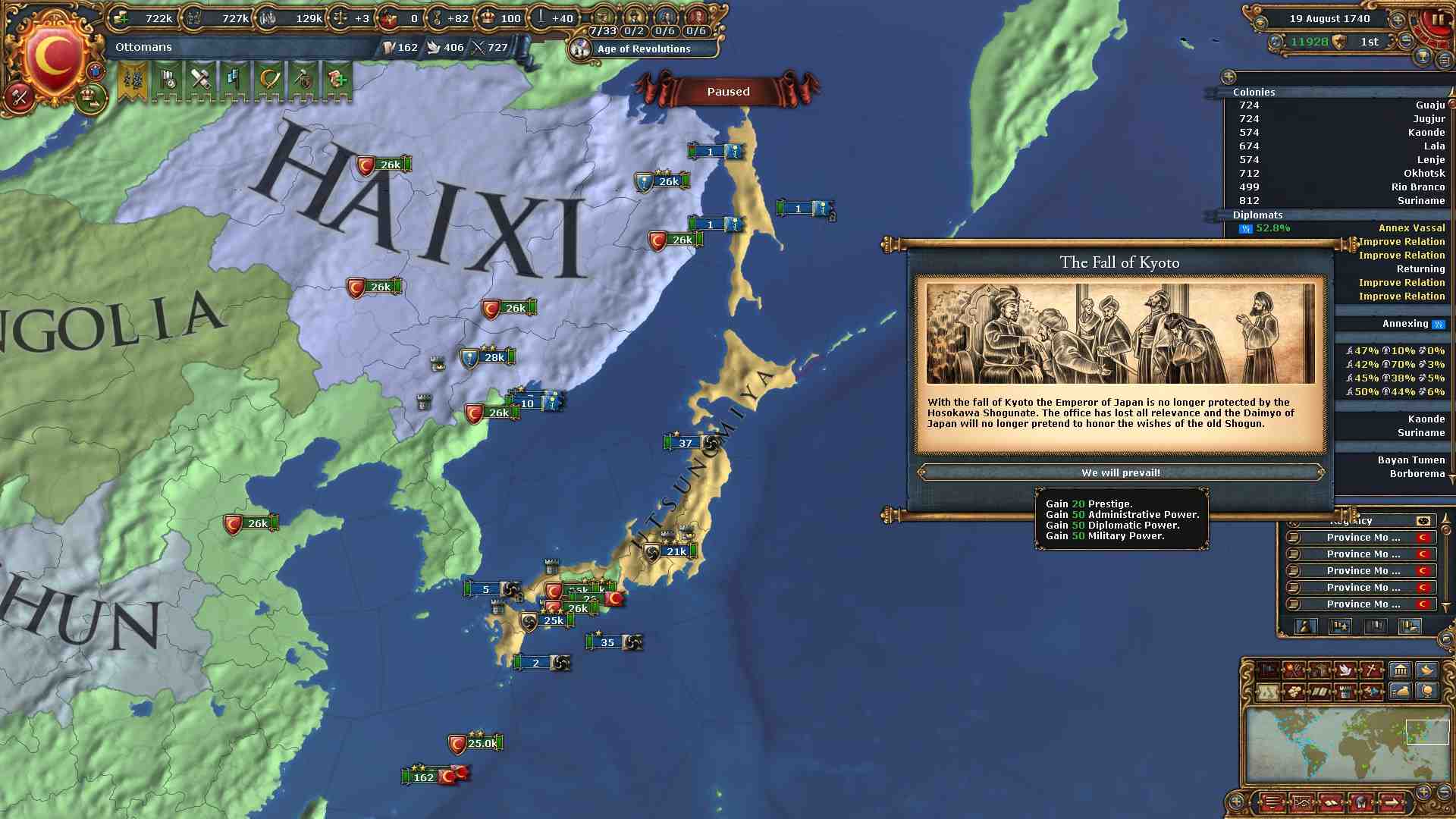 細川も完全併合。京都を得たので君主点を得られました。