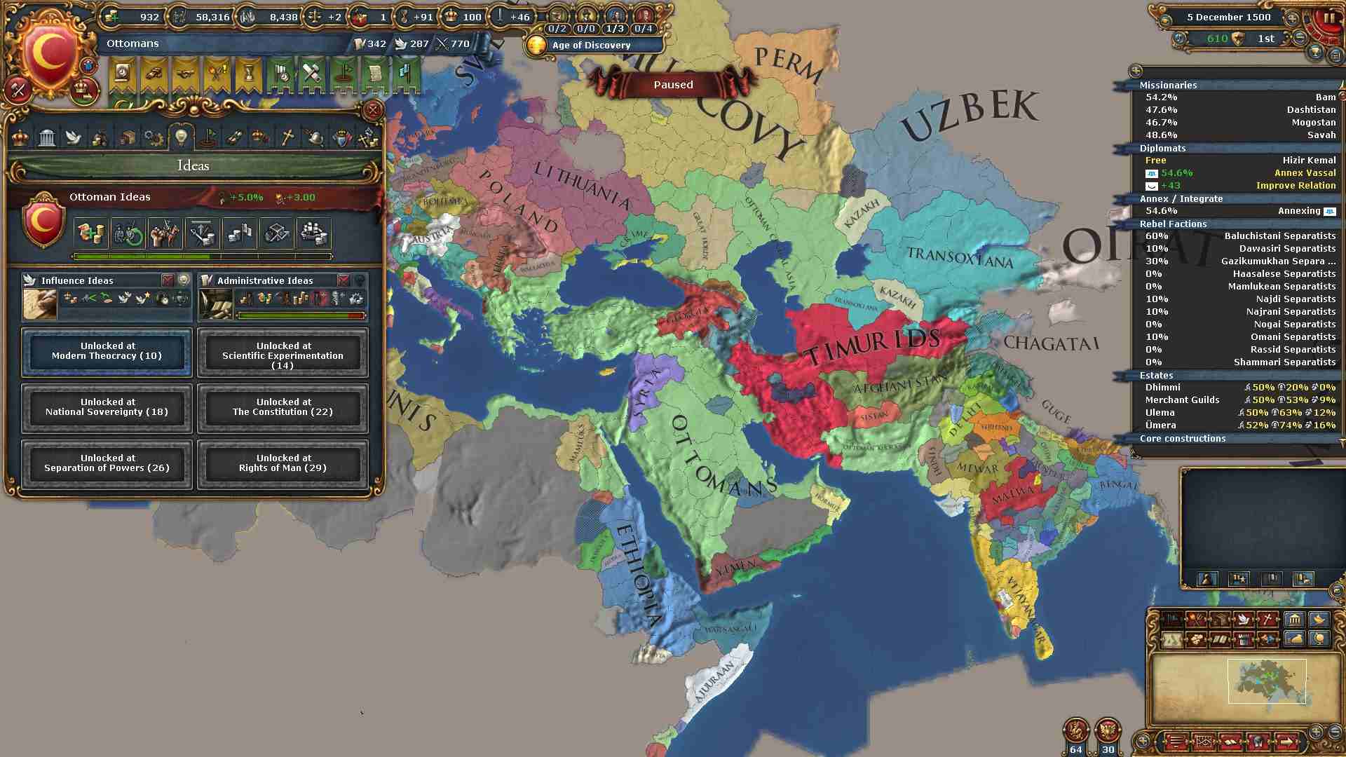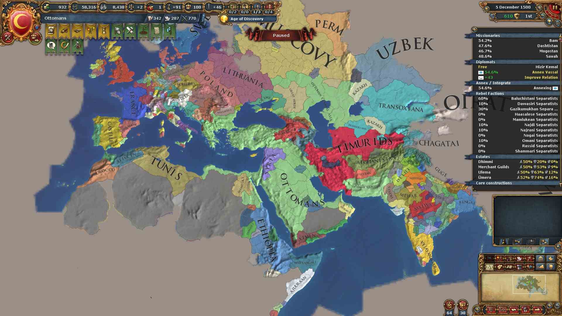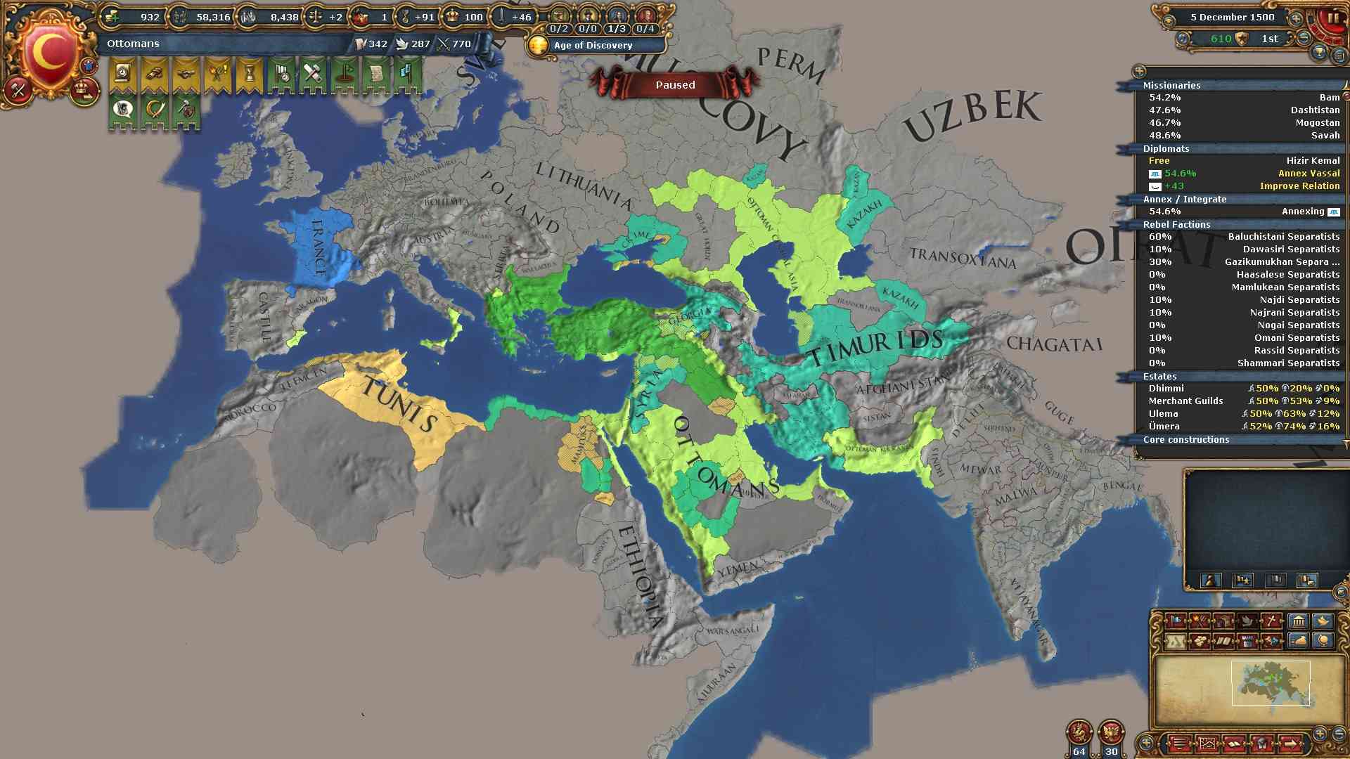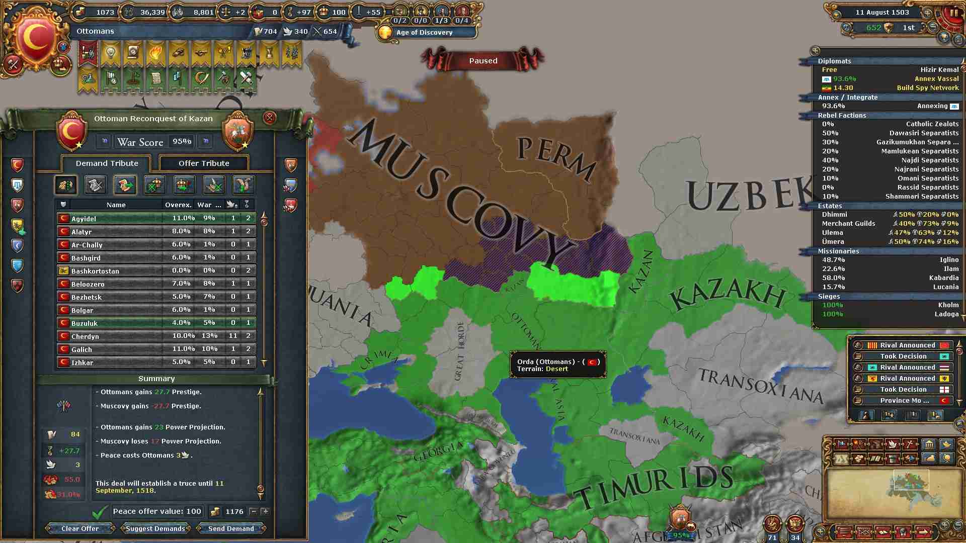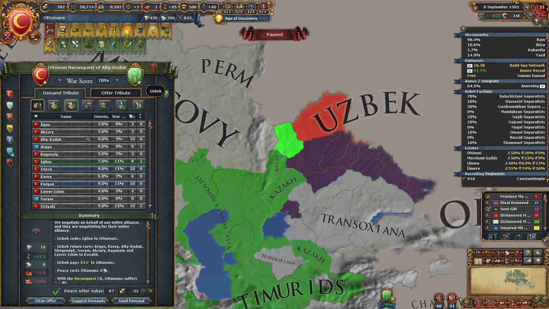 属国併合をすると外交評判が10年間-3されるので、前回の属国併合から10年経過してそのバフが取れるタイミングを見計らって次の属国併合を計画しています。