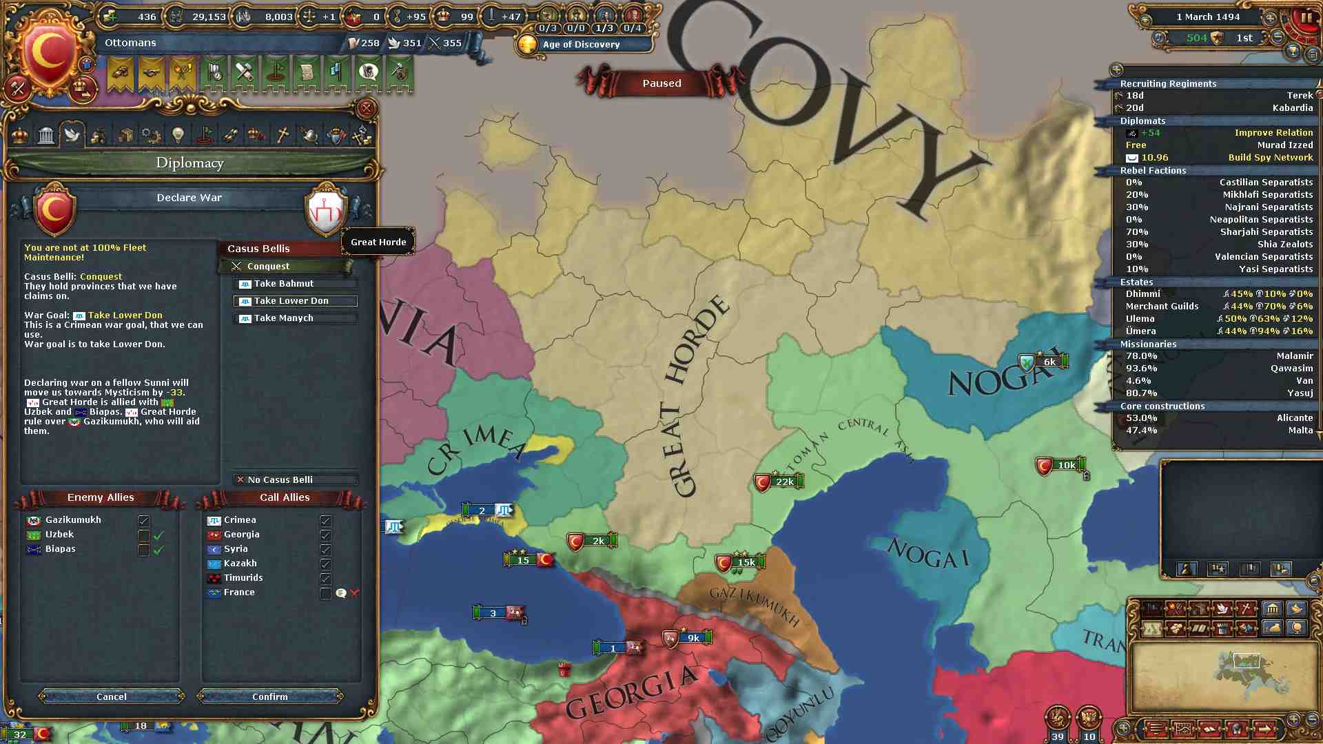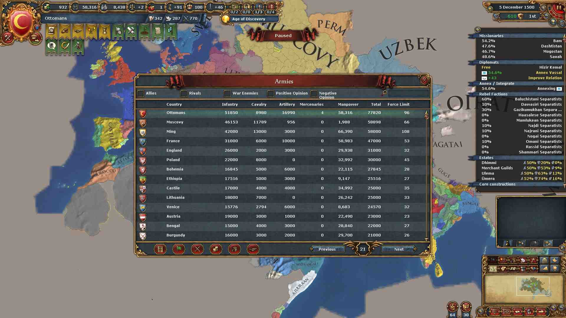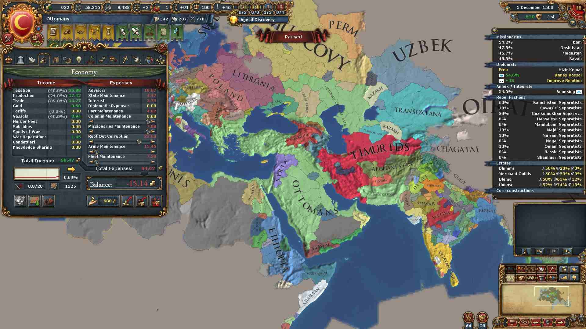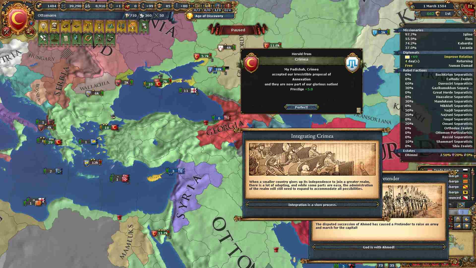 属国併合をすると外交評判が10年間-3されるので、前回の属国併合から10年経過してそのバフが取れるタイミングを見計らって次の属国併合を計画しています。