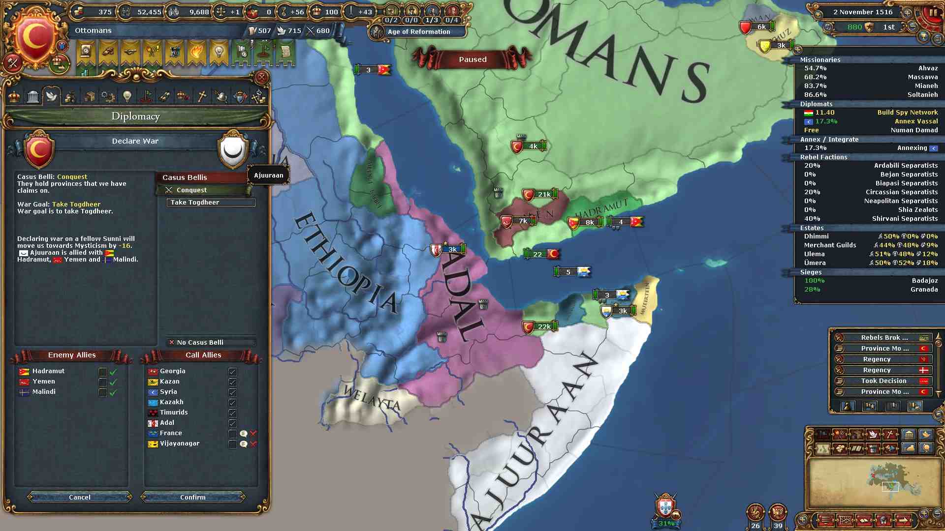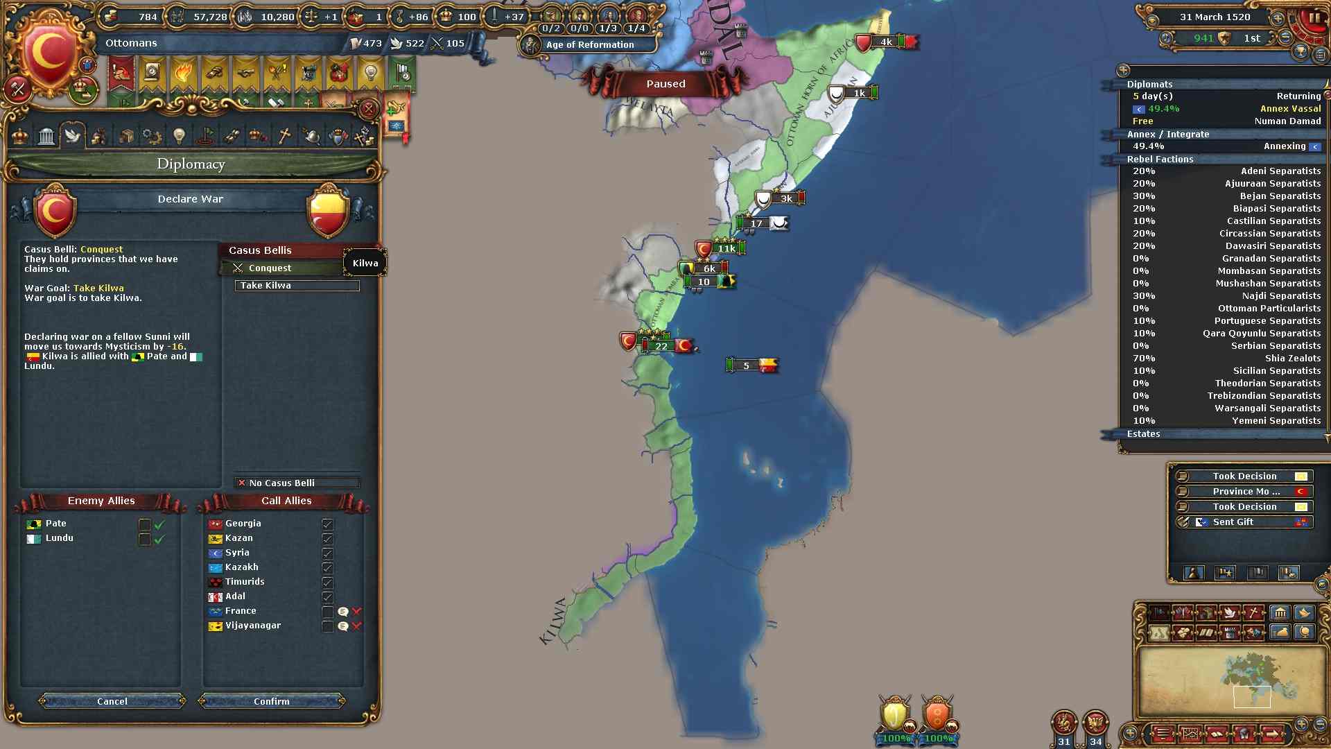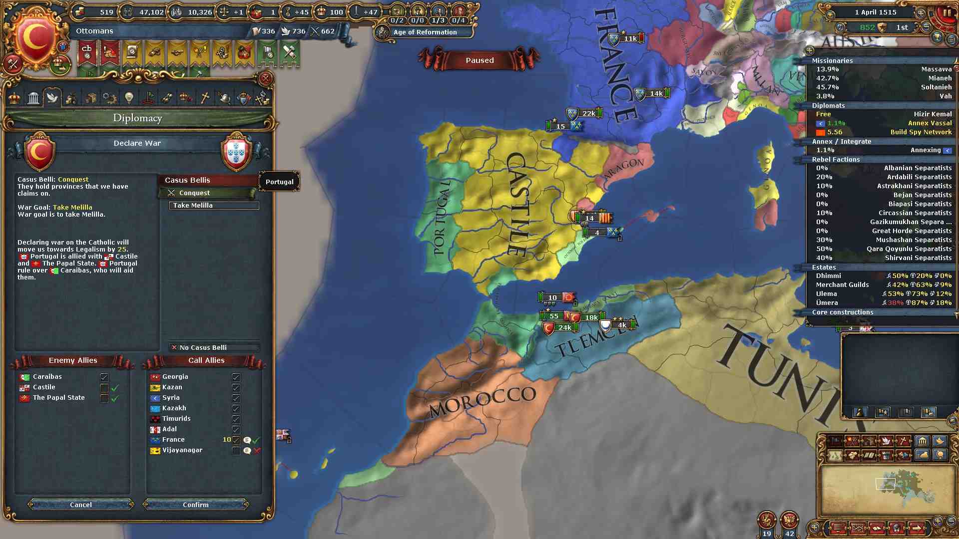 最後に残った「Unify Islam」に必要な州コルドバを持つカステラを釣り出す為にポルトガルに宣戦布告しました。