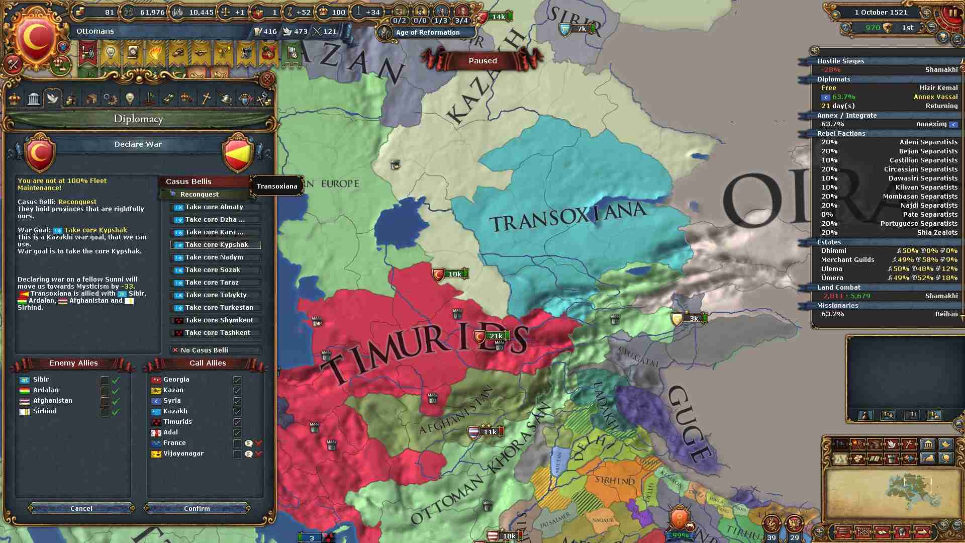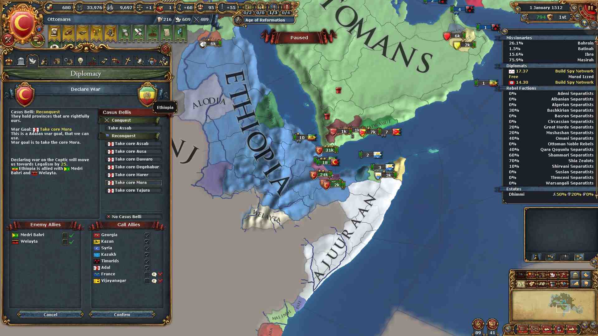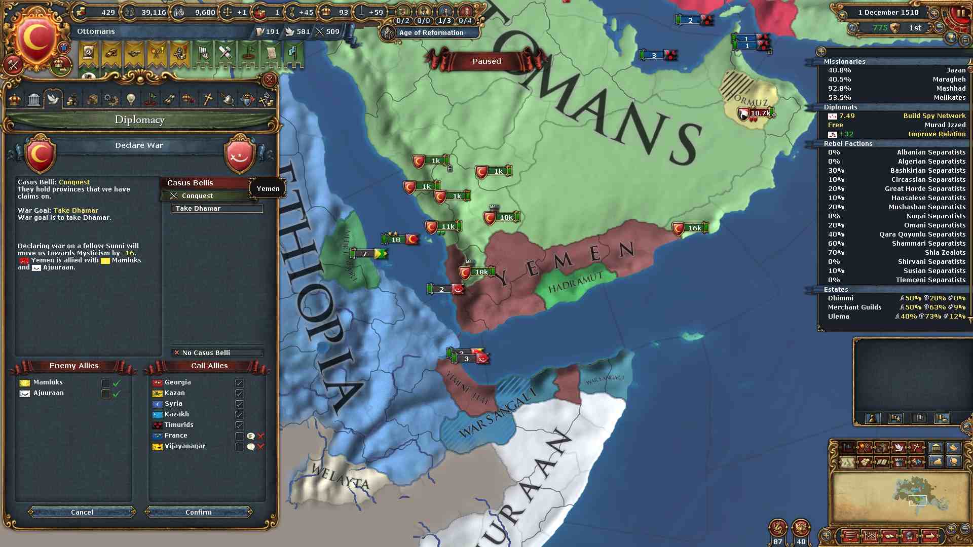 最後に残った「Unify Islam」に必要な州コルドバを持つカステラを釣り出す為にポルトガルに宣戦布告しました。