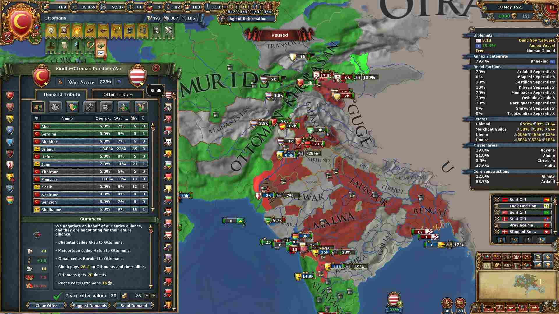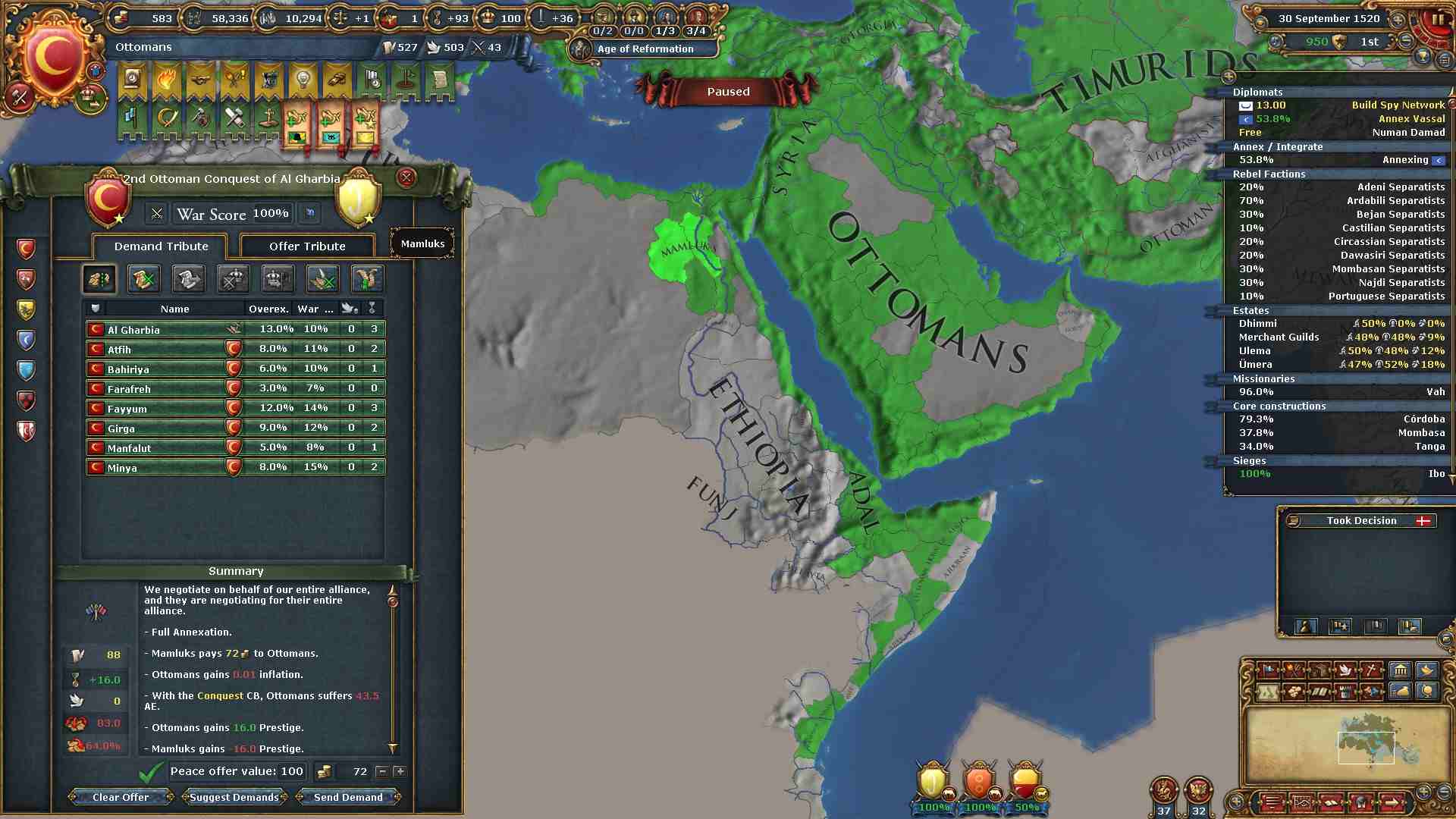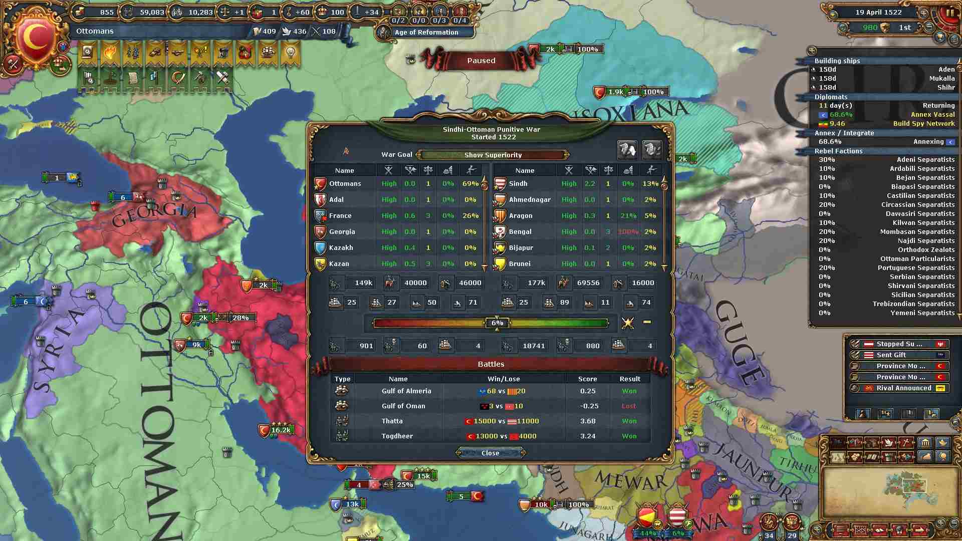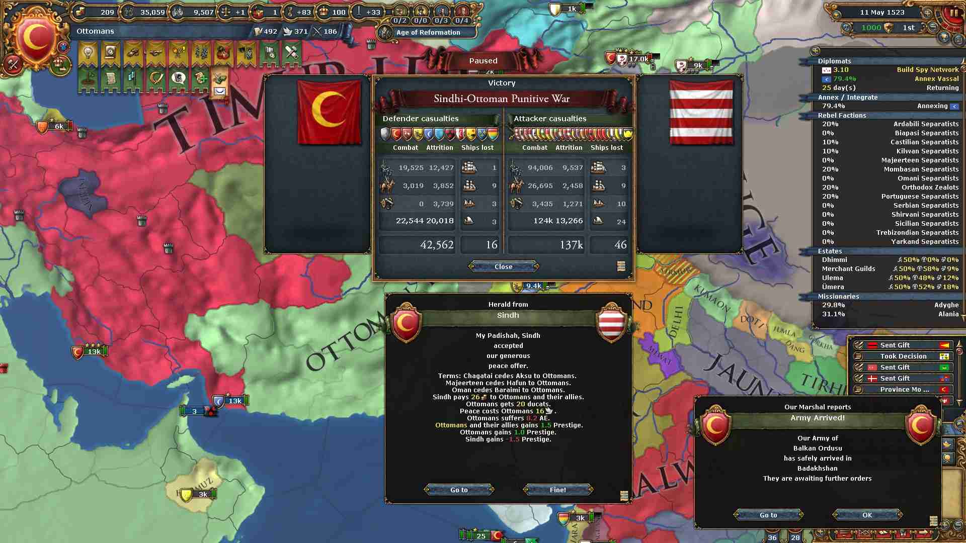 同盟国ヴィジャナガルの奮闘およびオスマン軍の怒涛の攻撃により、こちら側の勝利で戦争が終結しました。