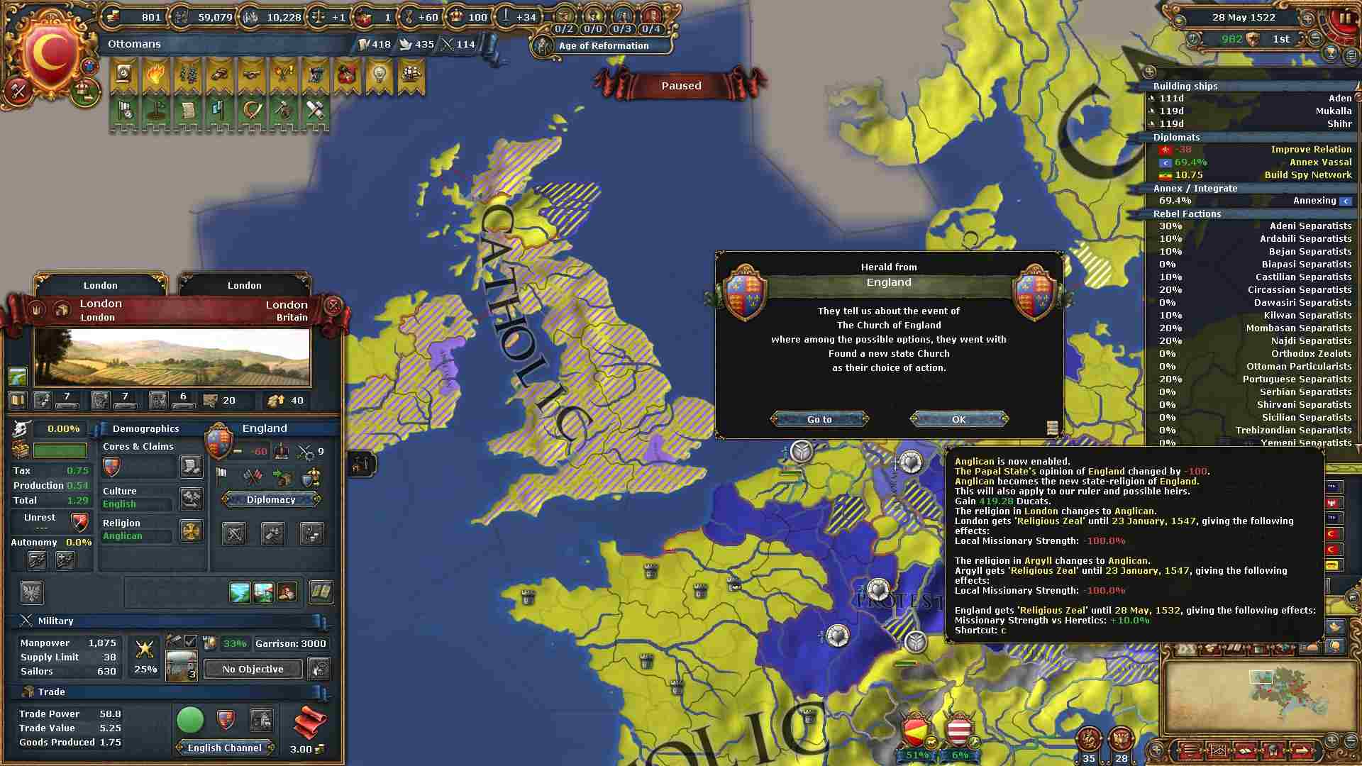 今回のプレイで始めてDLCの「Rule Britannia」を導入したので、イングランドがアングリカンを創始しました。
