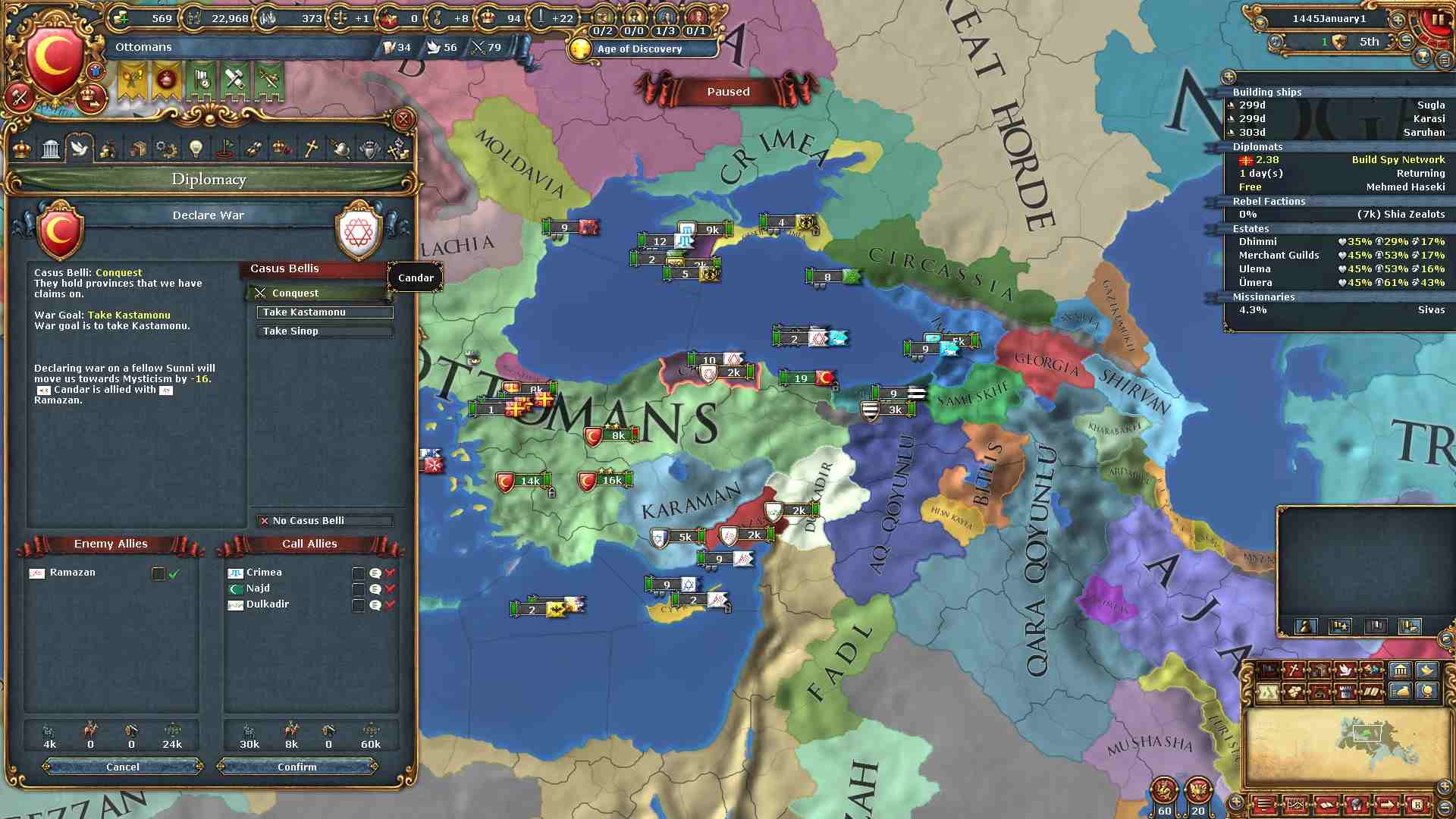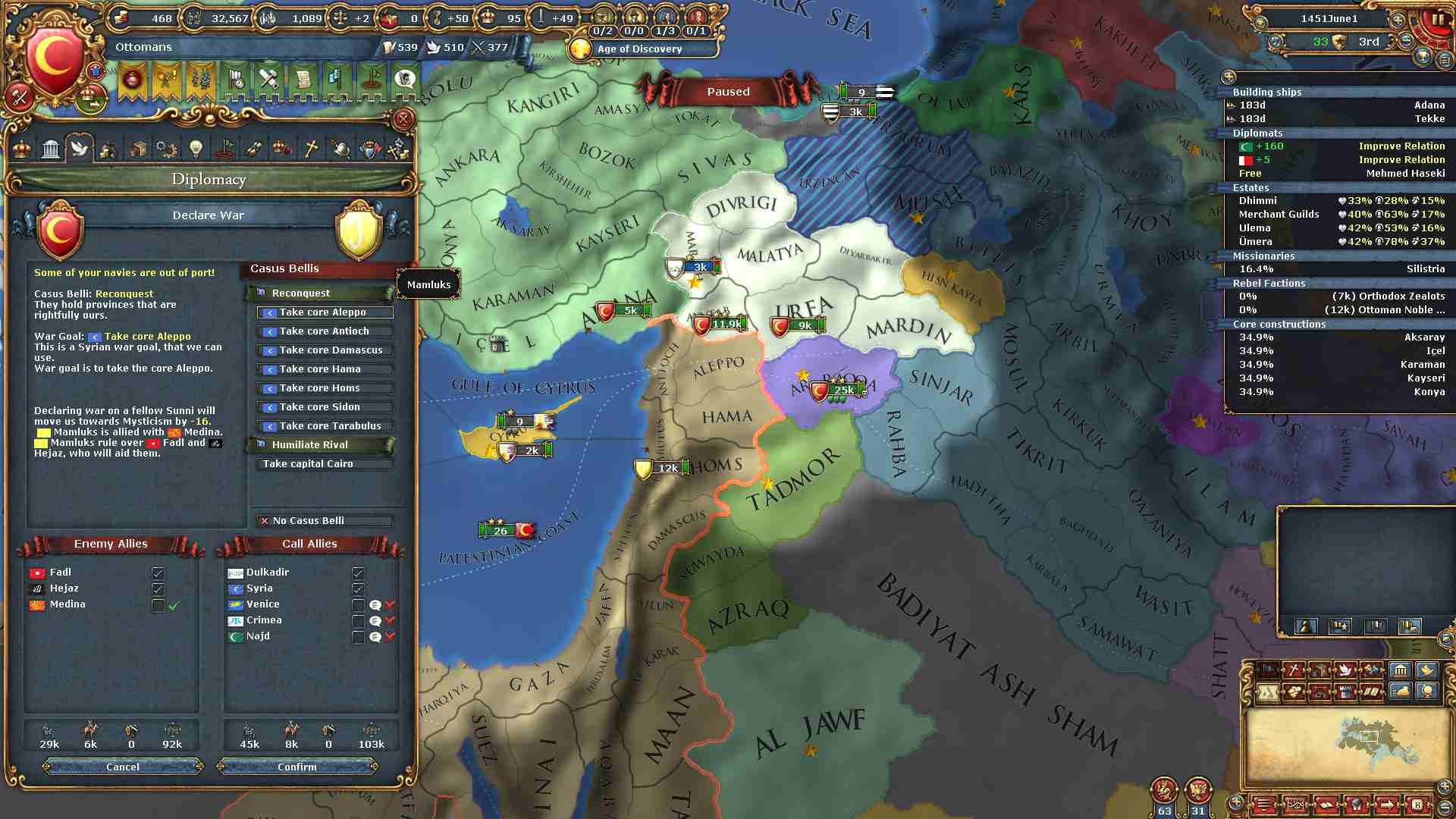 今回もスンニのままでOne Faithを目指しますので、まずは統一イスラムに必要な領土を獲得すべく動き出します。