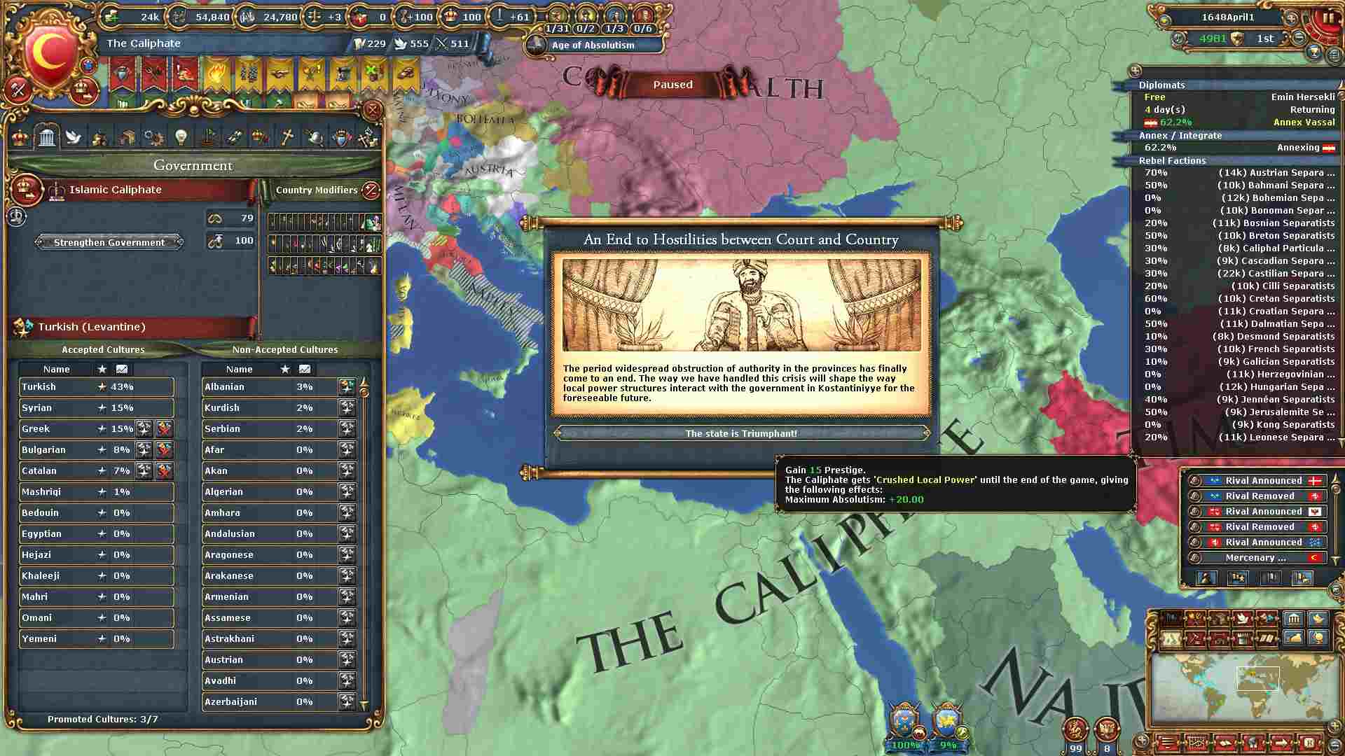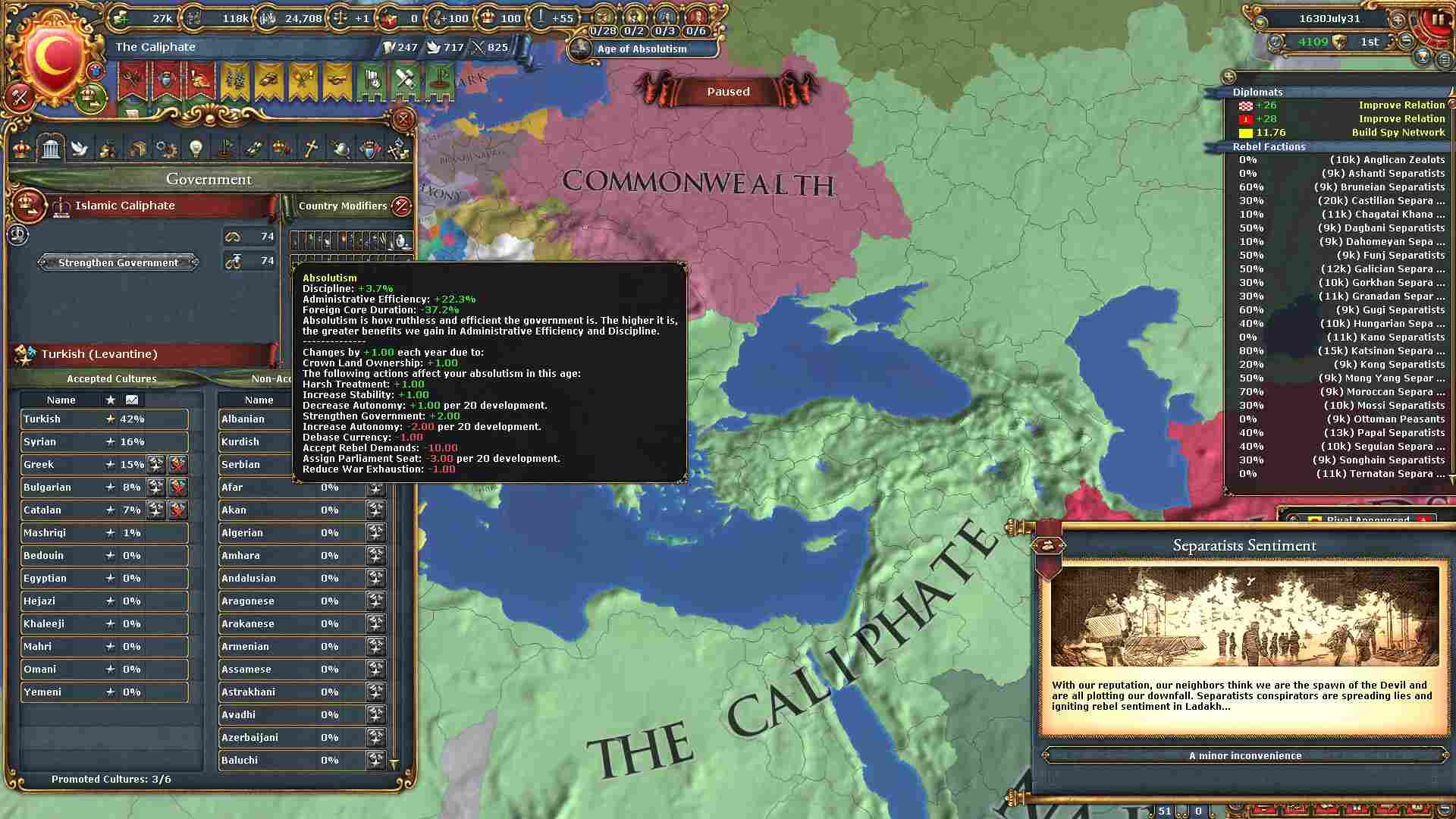 階級から特権の剥奪を進めた結果、ここまで絶対主義値が上がりました。