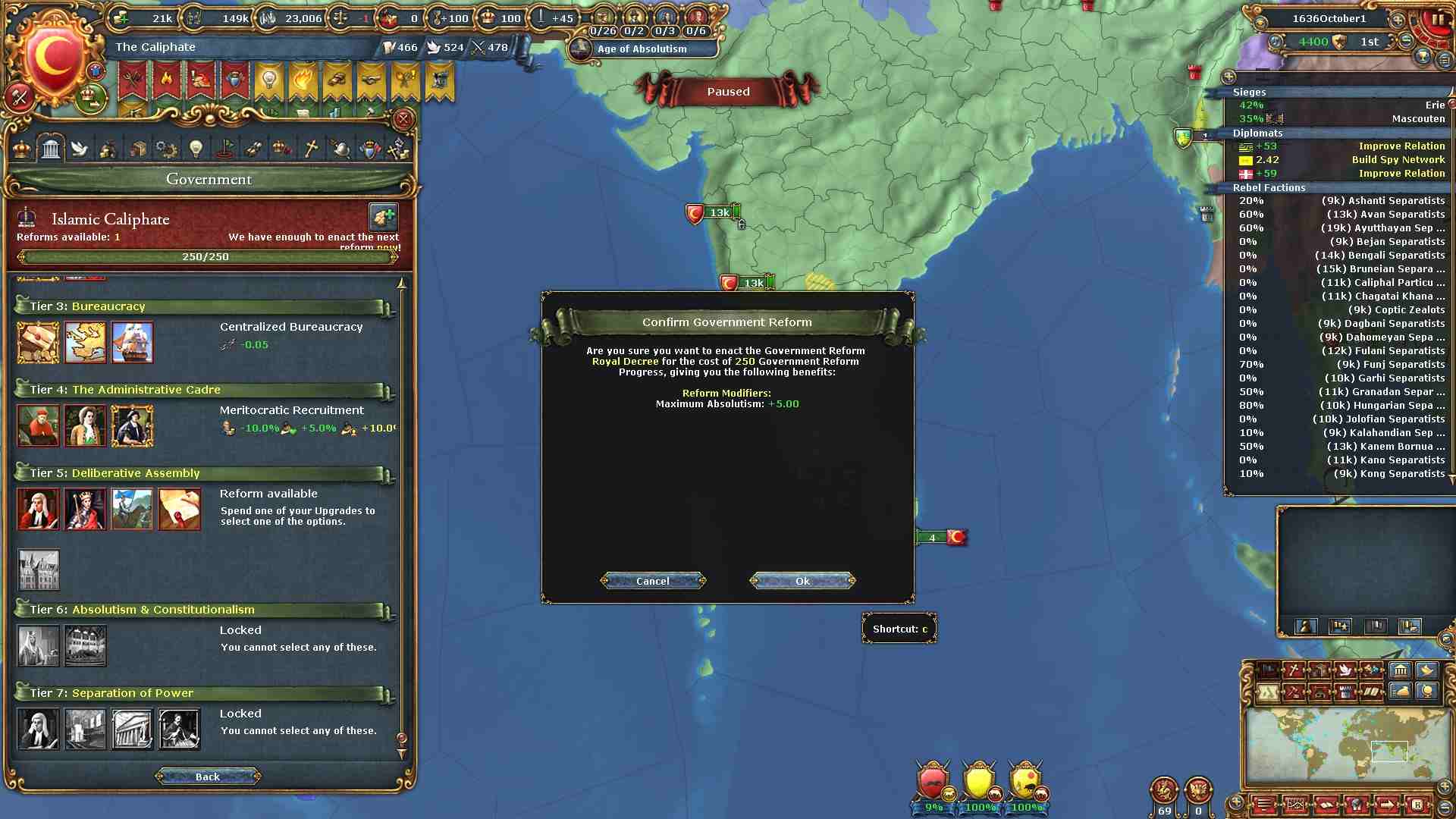 五段階目の政府改革を取得しました。最大絶対主義値UPを選んでいます。