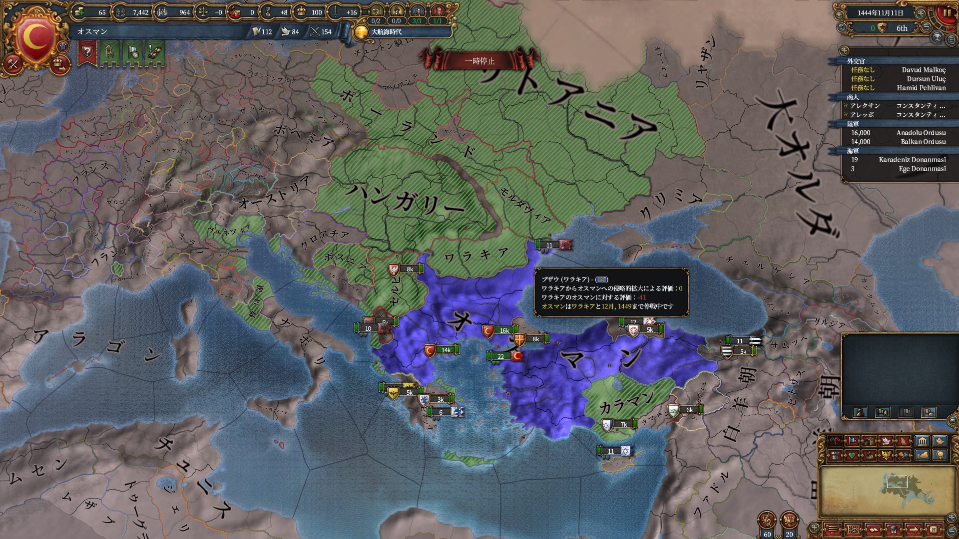 戦争疲弊の溜まりが非常に早くなり、ゲーム後半ではOEが空き次第順次講和といった形の流れを取るのが大変になりました。