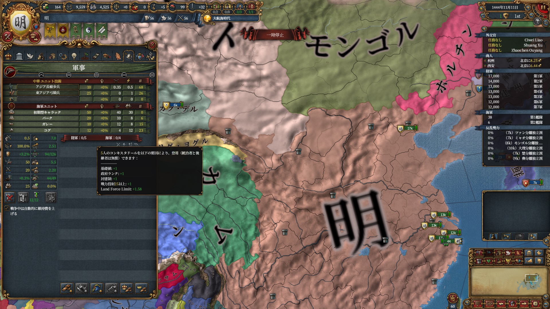 Army Professionalism100%に加えて参勤交代パレスLV3で将軍コスト-70%、政府改革によっては-80%になるので、日本は大量の将軍を使えて強いかもしれません。