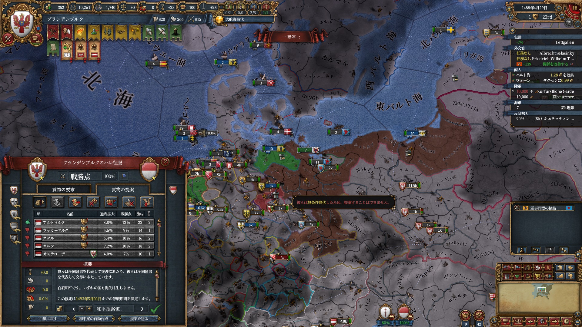 少し前のverではしばしば100点負け講和でブランデンブルクしかコアが無い土地をマクデブルク辺りに明け渡してAEを下げる戦略を使っていましたが、無条件降伏になるとこちらの負け条件を受け付けなくなります。