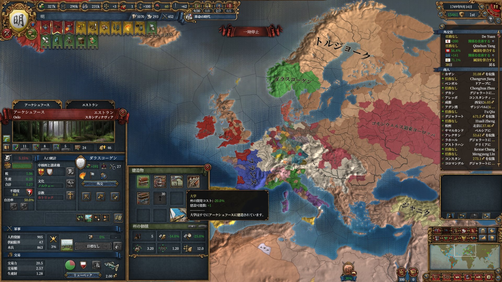 ゲーム後半は世界中に乱立した工場から中小国も結構な交易収入を得てしまう事が多く要塞が安定して維持できようになってるのかなと思います(あんまり中小国をやらないのであくまでもイメージです)。