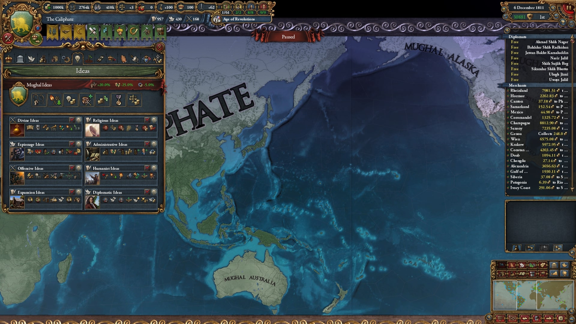 SunniのMughalsはBase+1、遺産(Jerusalem、Djenne)+2、Roma+1、Mecca・Medina+1、DoF+1、Religious Idea+1、