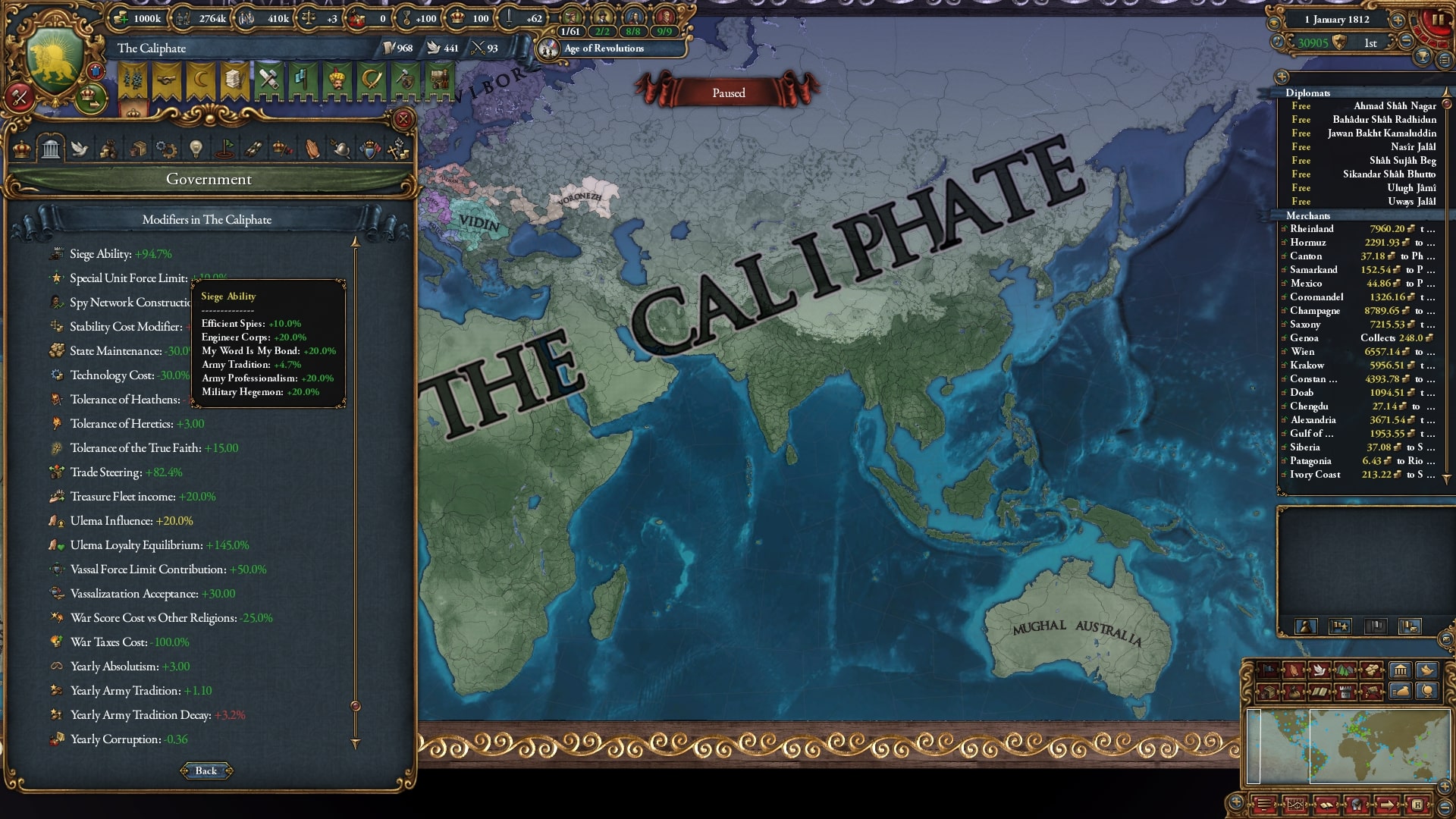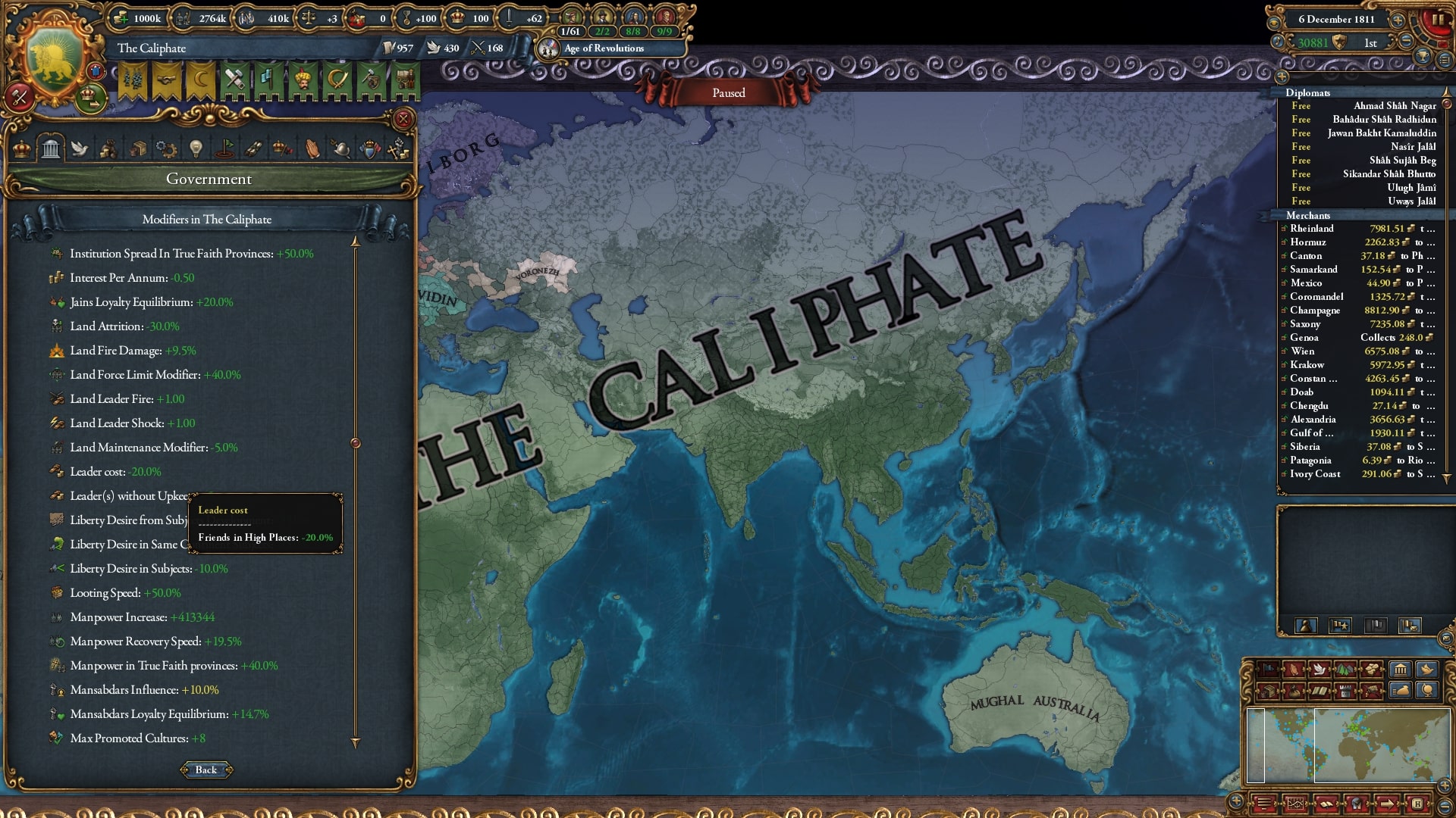 アイデア(Religious)+3、政体(Feudal Thocracy)+1、遺産+5(Ache、Tikrit)、顧問+2、