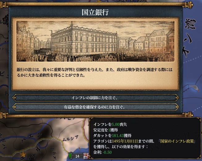 ・経済アイデアを取ると国立銀行イベント(リンクは英ウィキのイベント解説:https://eu4.paradoxwikis.com/National_Banks_events )が発生する可能性があります。MTTH480か月
