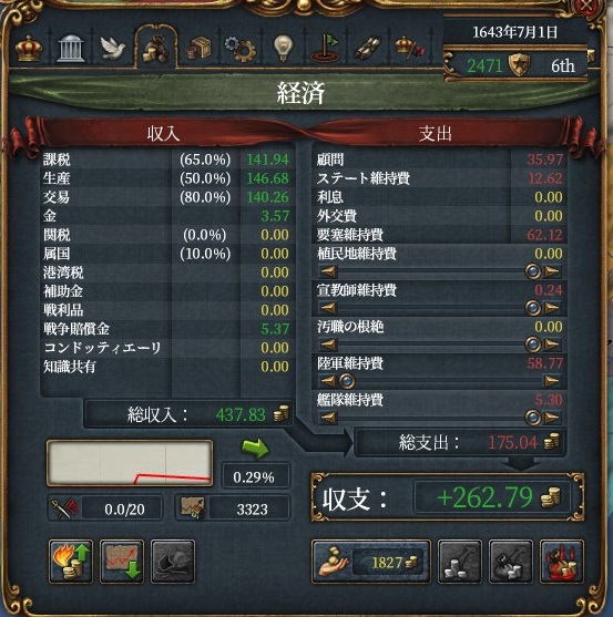 現に統治50を支払ったdev16の農地はたった4点でポチれて、この時期には君主点が余りはじめた結果大量のdev30州を量産できました。