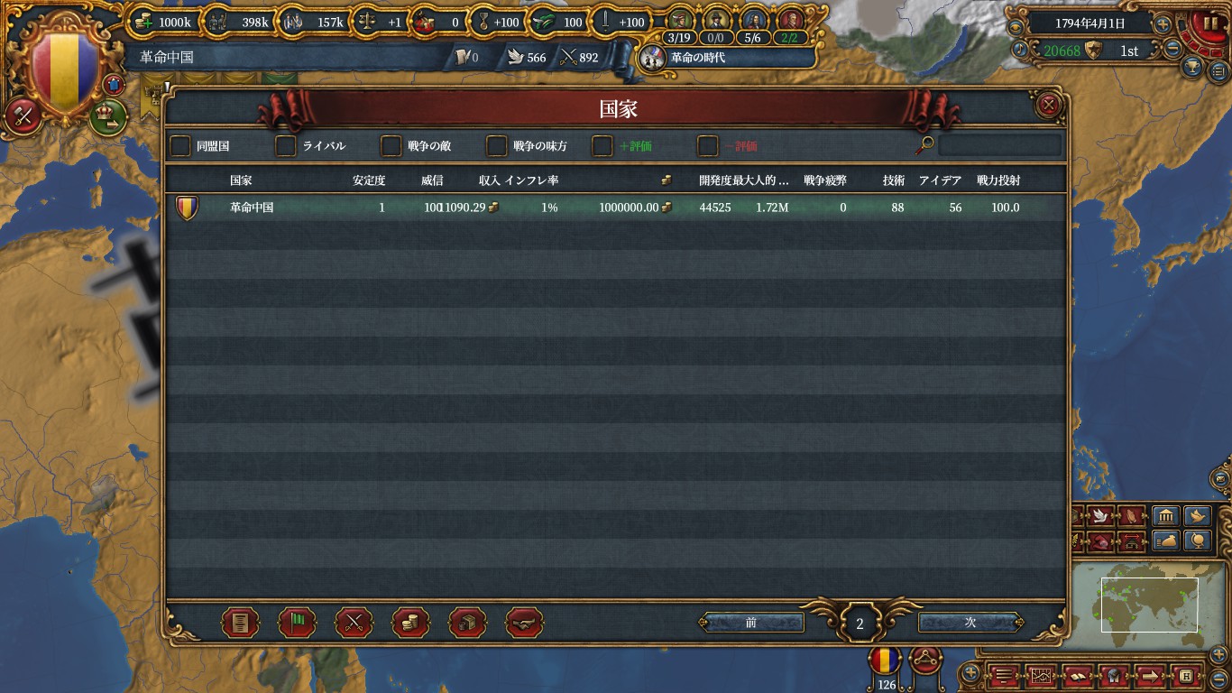 しかしながらフランスが既に革命目標だったため、共和国伝統を上げるついでに軍事点を使い革命情熱を高めて革命を宣言。