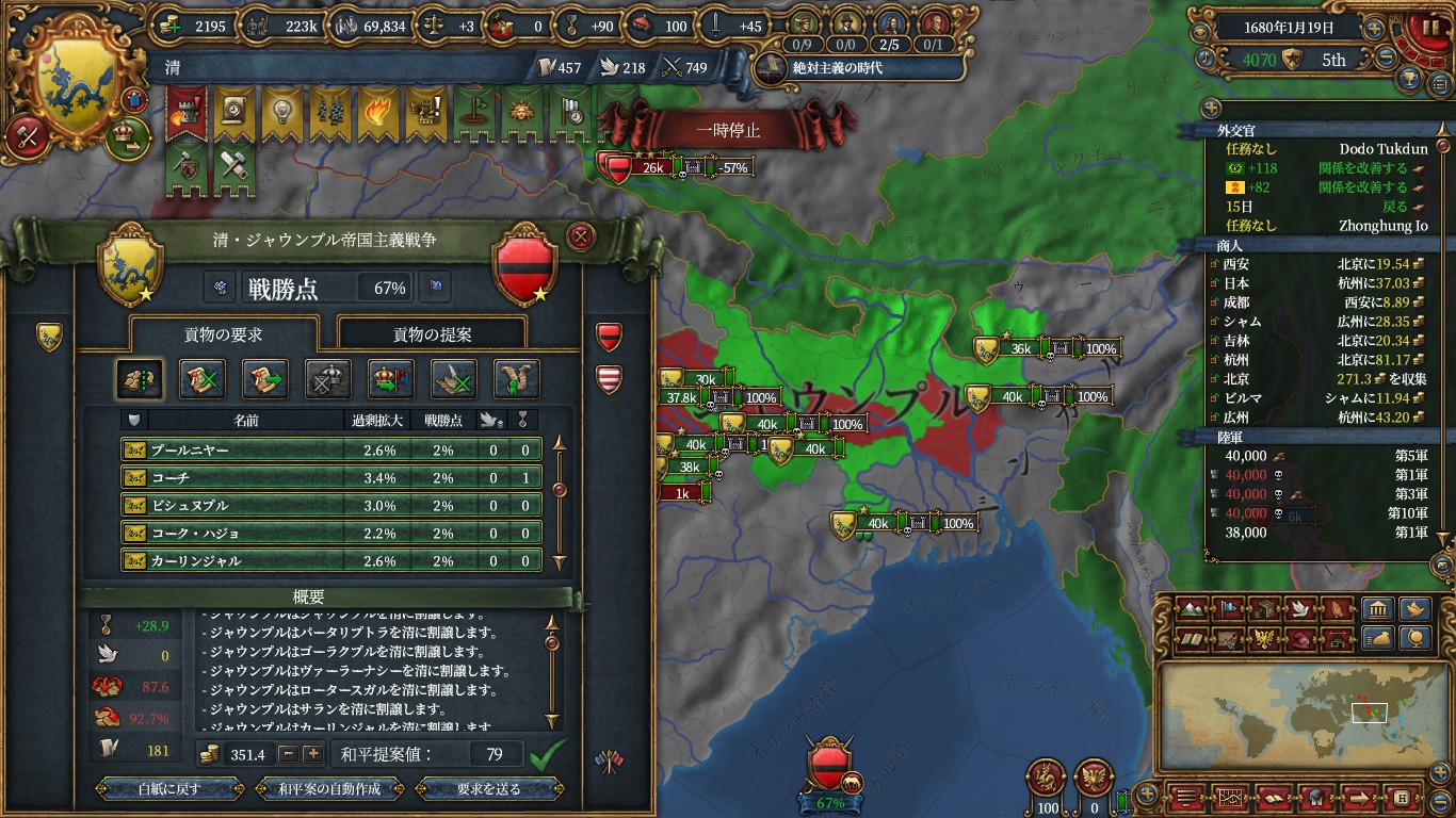 宮廷と国難を終え、清に変態し終えたのでミッションの請求権を利用してチャガタイ、朝鮮、東南アジアに侵攻していきます。