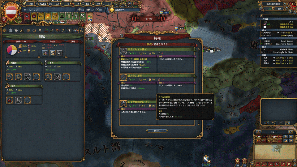 属国2つ出来たら強力公爵、陸軍伝統溜まったら将軍コスト-25%、初手で全階級のの忠誠と影響+10%
