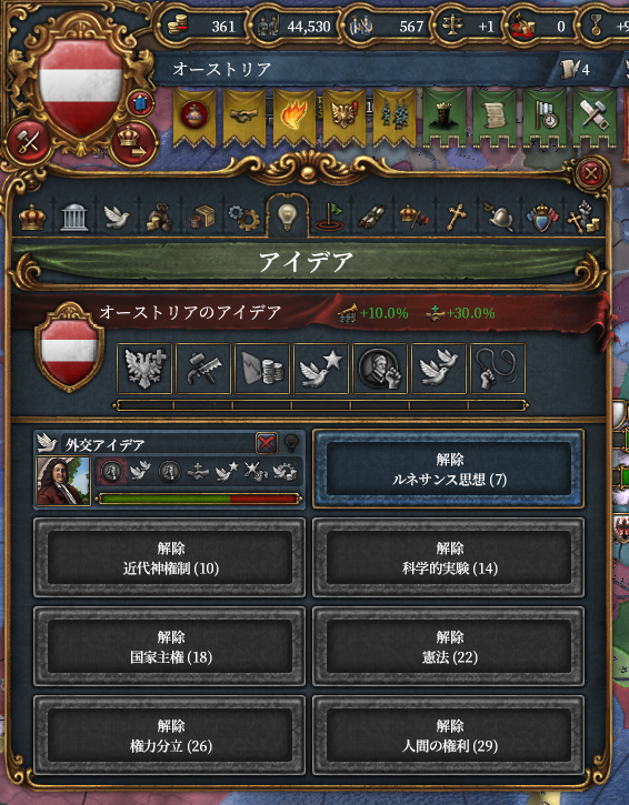 統治技術が5まで進んだので外交アイデアを取得。HREプレイのお供に必須の一品。