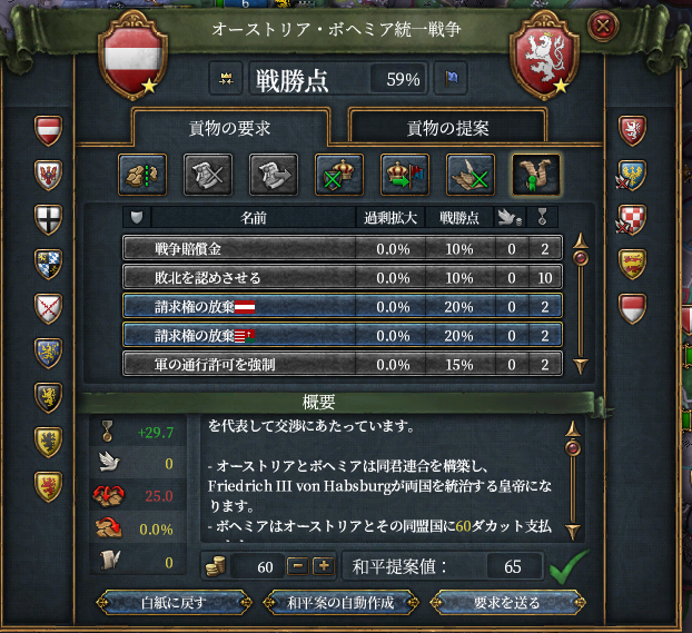 戦勝点59で要求を飲んでくれました。ボヘミアの兵も逃げてくれていたので助かります。