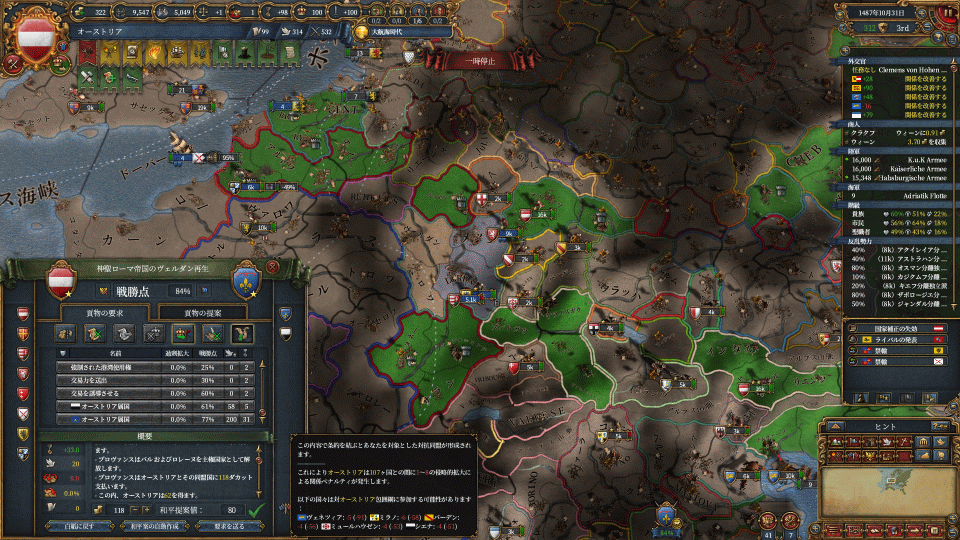 ちなみに戦争疲弊に外交点使うか問題。基本は使いたくないのですが、戦争疲弊がボトルネックになる時には少し使ってます。