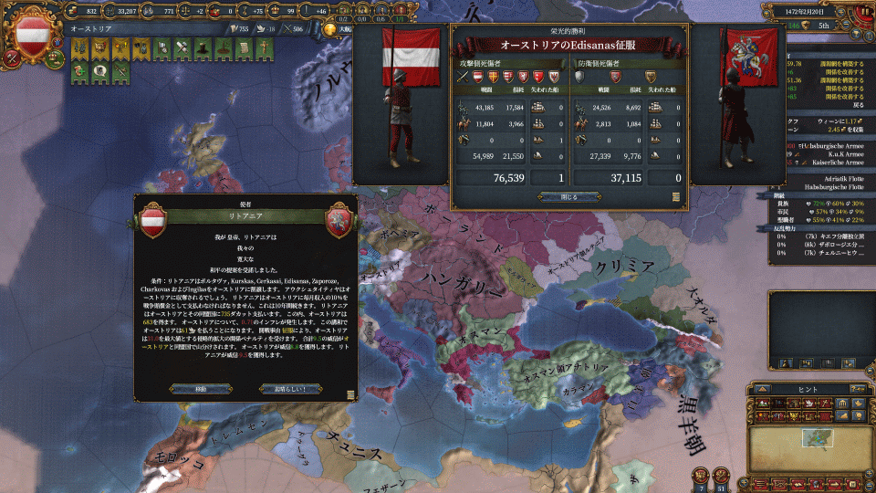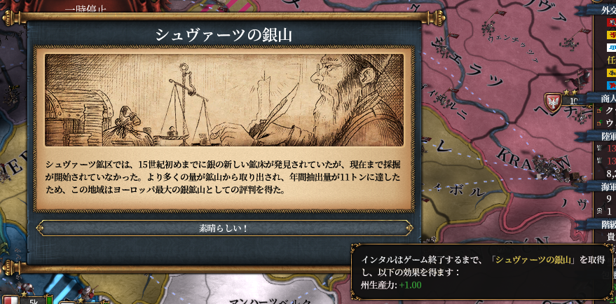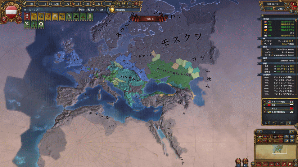 オスマン戦の戦争疲弊を癒やしつつ、帝国の権威が貯まるのを待ちつつ、東へ進む計画を立てます。