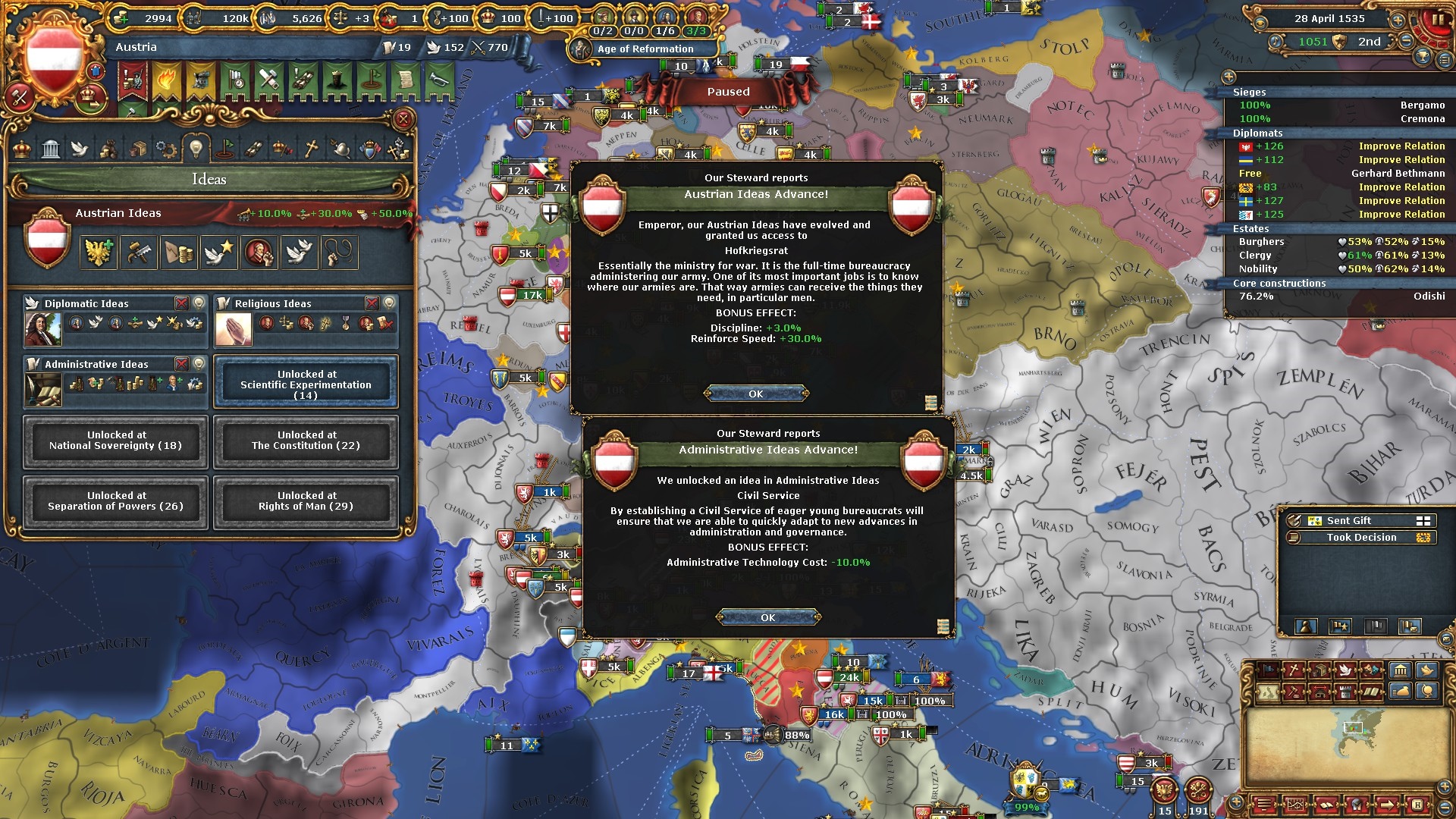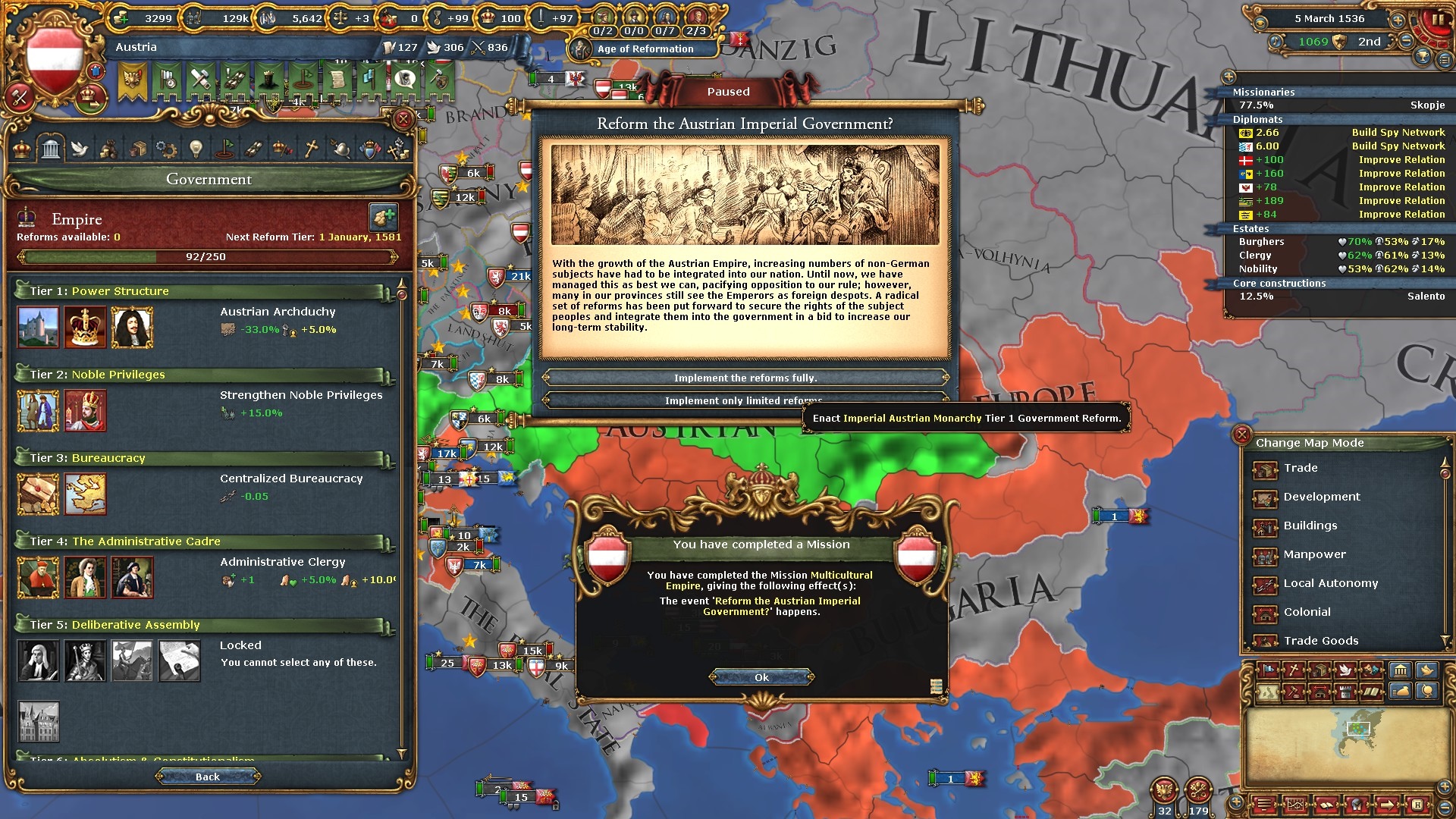 今度はミッション「多文化帝国(Multicultural Empire)」を達成し、オーストリアの1段階目の政府改革が変更できます。