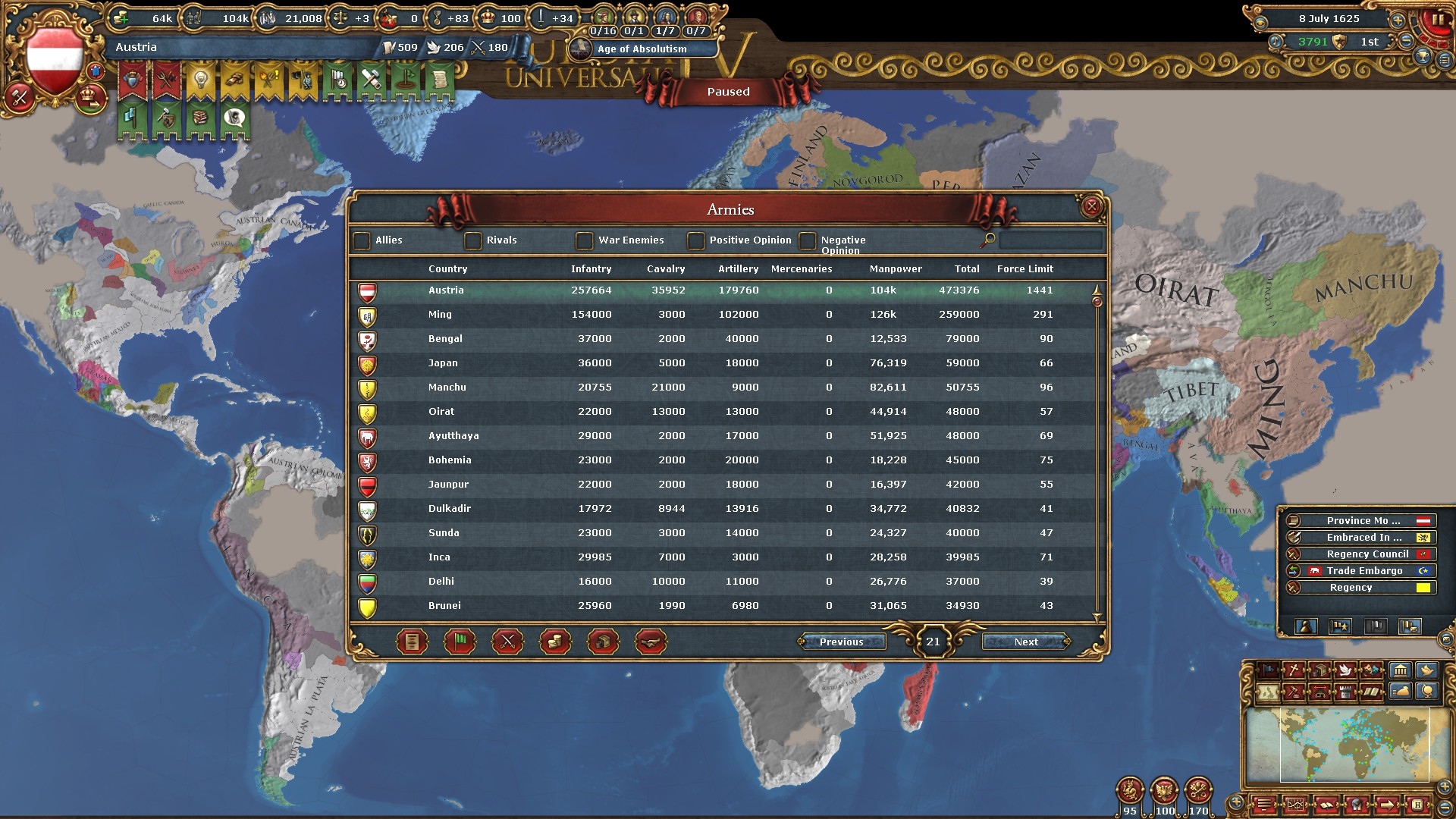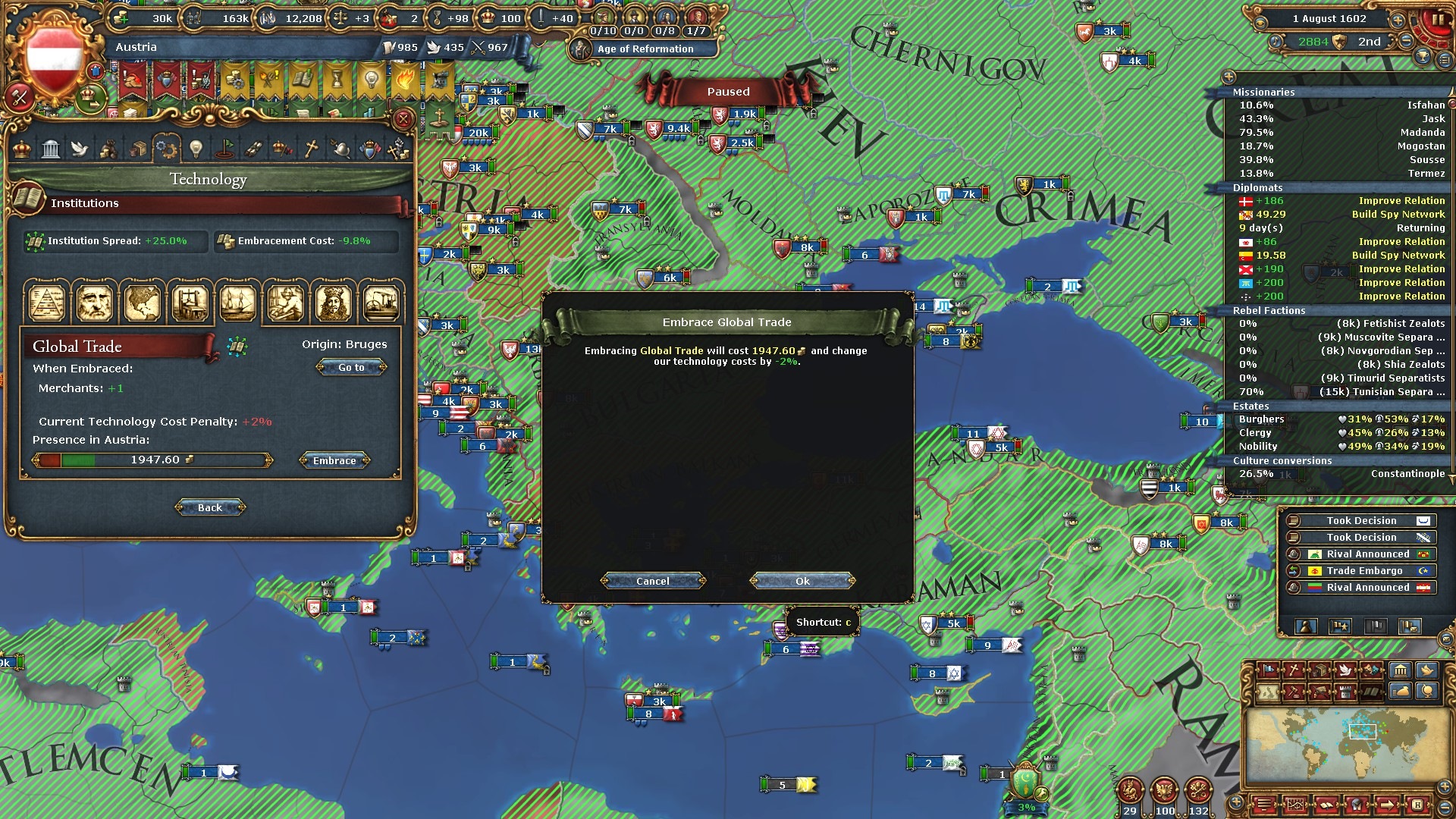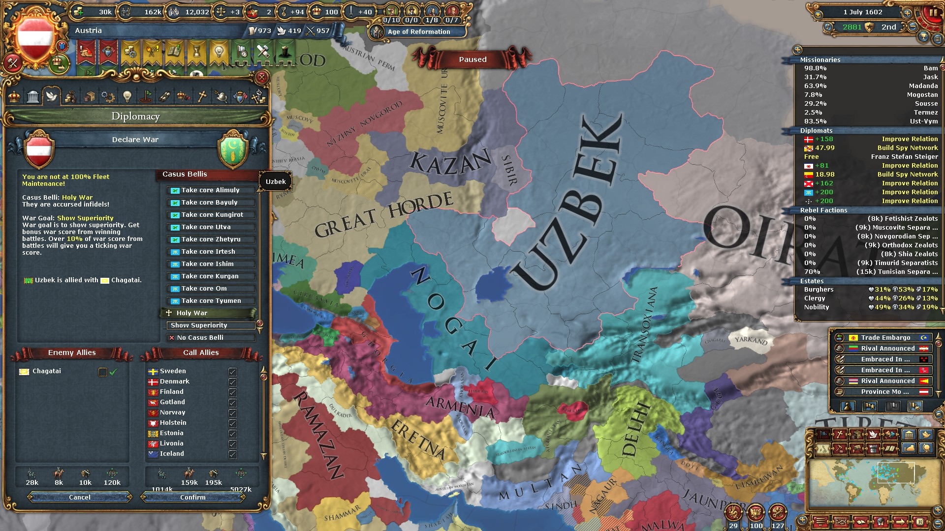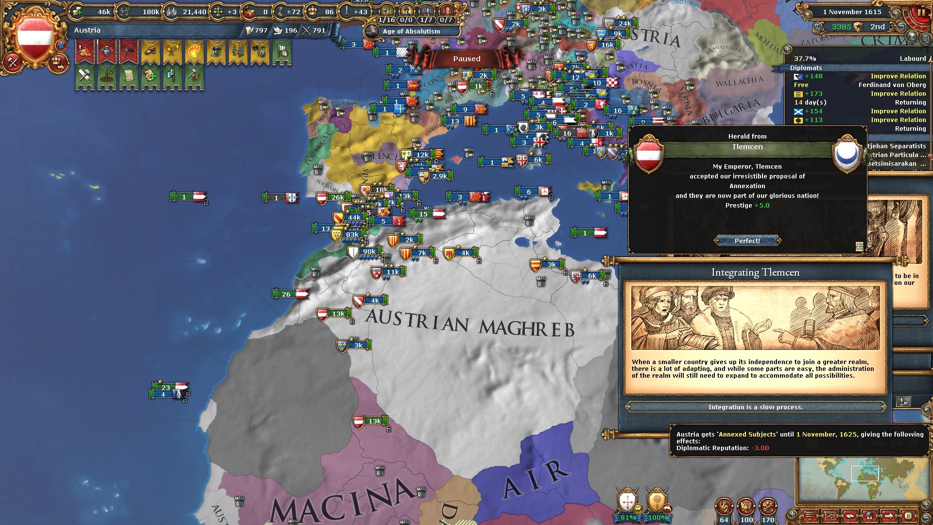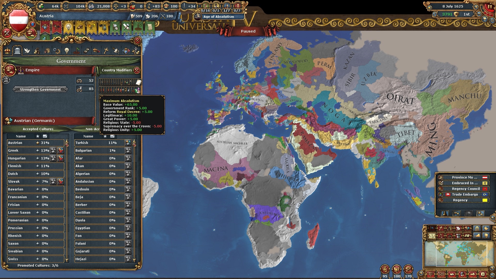 オスマンAARの時と違い神聖ローマ帝国ファンネルプレイでは、自国領を少なくできるので改革ポイントを稼ぐことが可能となります。