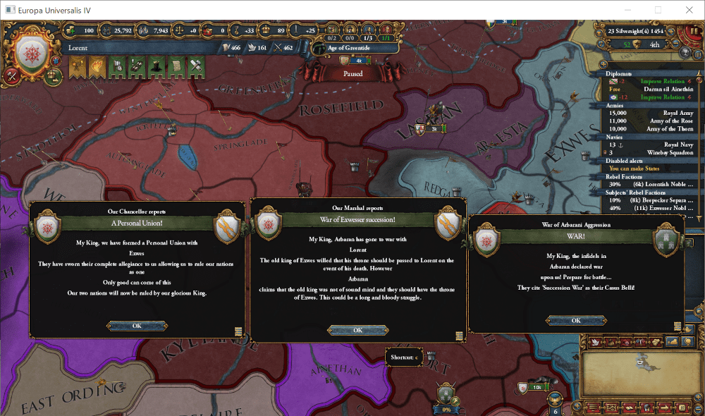 なお、この継承に対して、Arbaran辺境伯が異議を表明し、継承戦争になりました。敵は単独で、こちらは同盟国も参戦しているので、まず負けません。