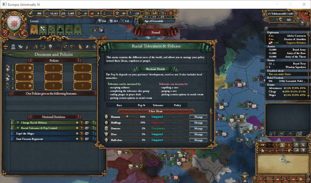 例えば、統合状態のElf少数派がいるプロヴィンスには、税補正+20%・生産効率+10%・交易品生産量+10%のバフと、ステート維持費+50%・月間自治率上昇+0.05のデバフが付与されます。