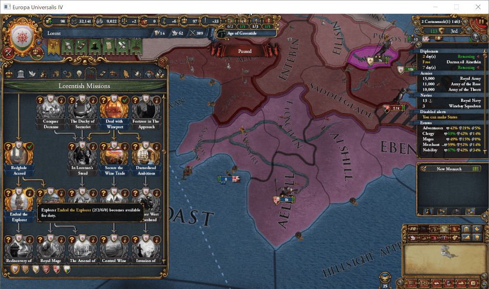 Lorent王国もこれを支持、これ以降、守護神としてCorin(陸軍士気+10%、陸軍指揮官白兵+1)を選択できるようになります。