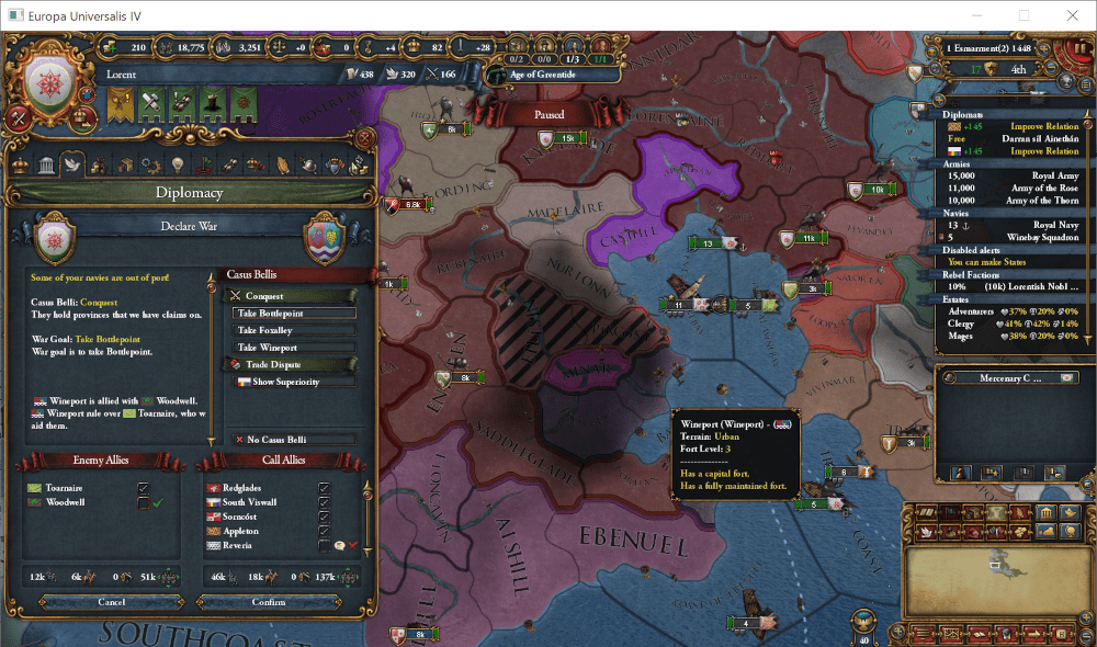 1448年2月、将軍と一時的に傭兵を雇いミッション達成、ついにワイン諸侯に宣戦布告します。最初の標的は交易中心地を二つ持っているWinesport公国です。敵同盟国含めても非常に弱いので、軽く潰します。