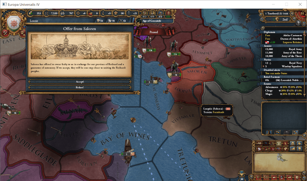 1445年1月、南方の小国、Saloren州が我が国の領土一部割譲を条件に属国になりたいと提案してきましたが、外交枠・独立欲求共に余裕がないので拒否します。あとで攻め滅ぼします。