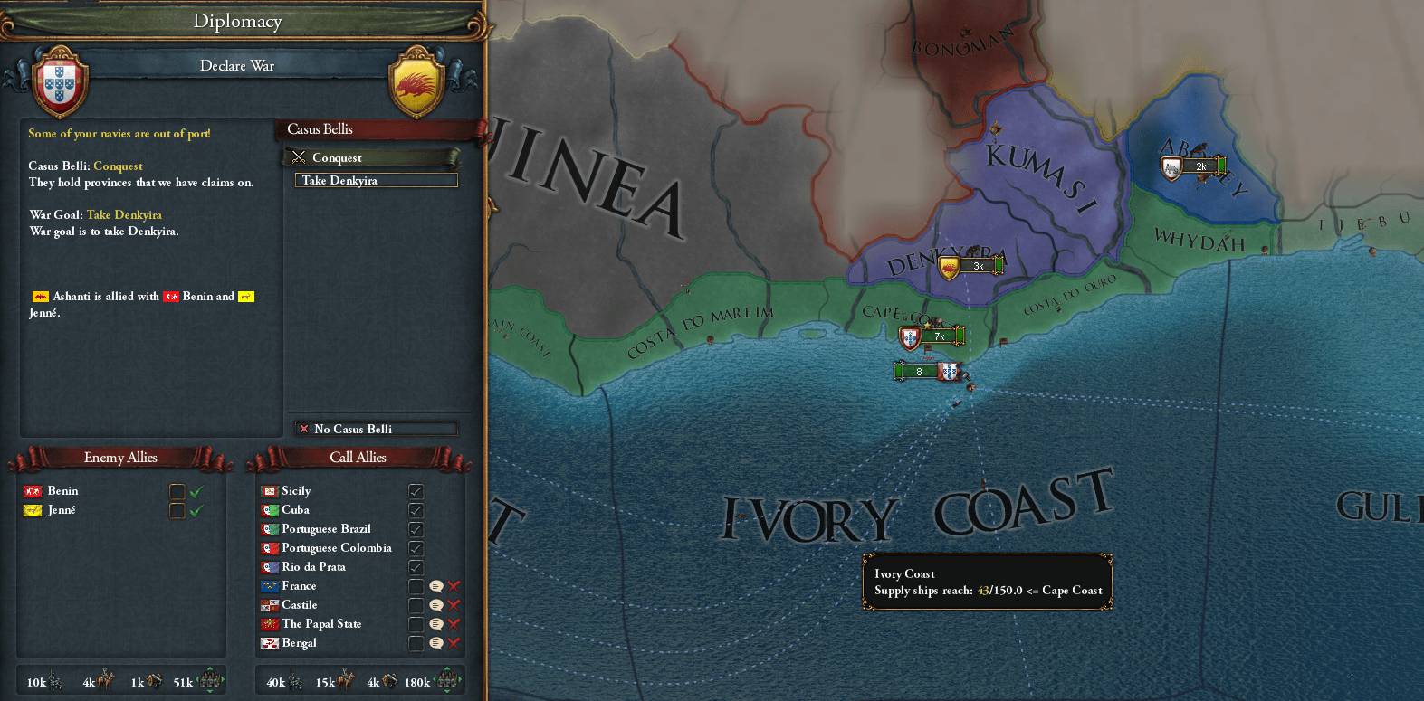 その際、Supply_range(補給範囲?)が足りず損耗が生じると判明したので、Franceに1.7ducats/月でFleet_basing_rights(港湾使用権)を貰った