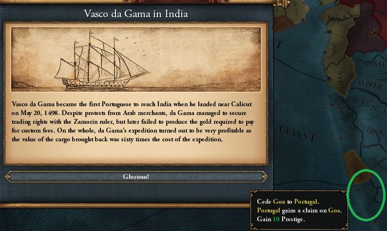 ついでに4-4と4-5、4-6も達成しておいた。Hormuzに恒久的請求権を獲得。隙があれば取っておきたい 4-5の方は(5.5.5.0)の☆3探検家とインド南部に恒久的請求権を獲得したほか、イベント"Vasco da Gama in India"が発生し、BahmanisからGOAを獲得