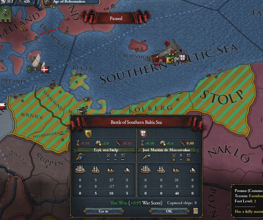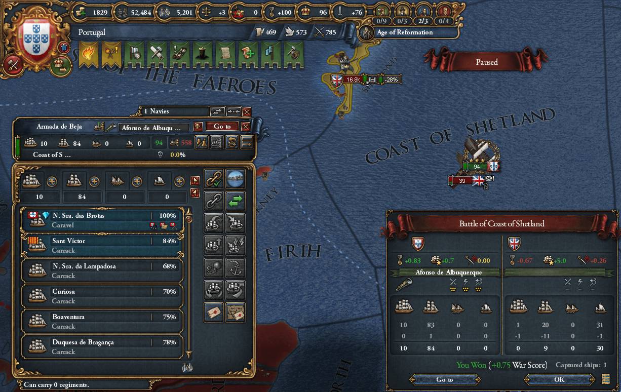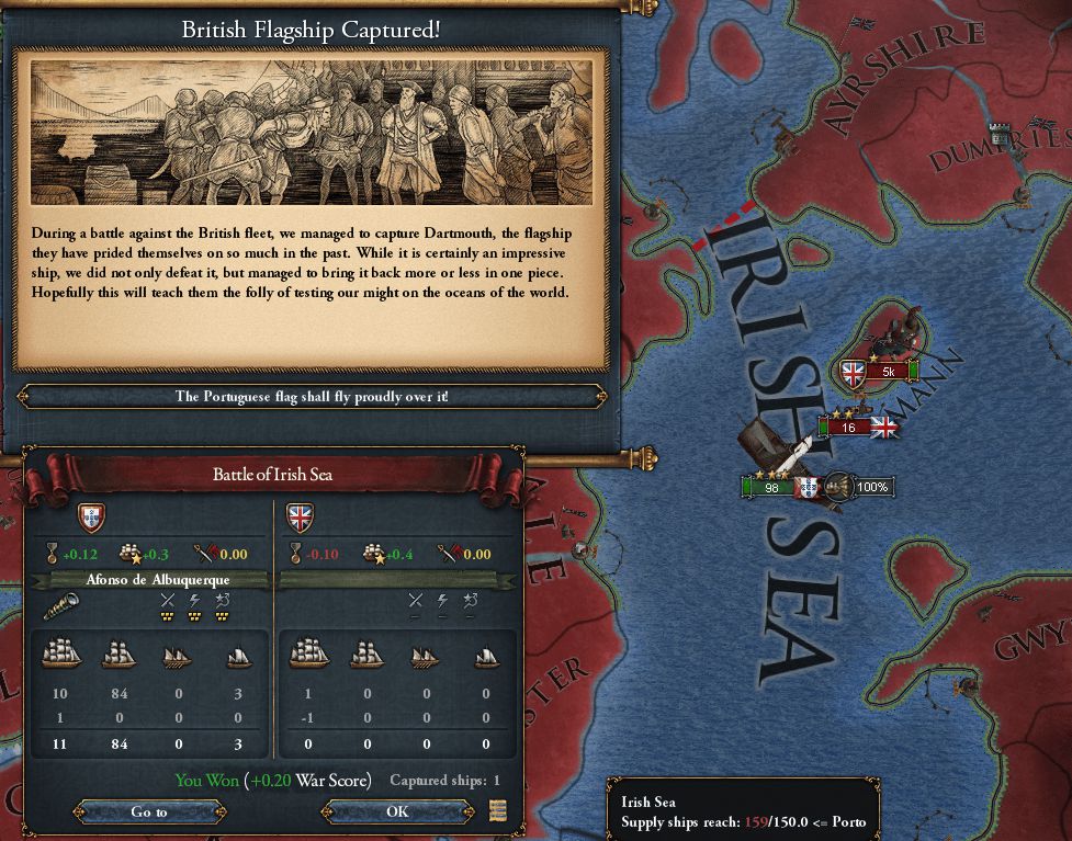 2か月後の海戦にも勝利し、Great_Britainの海上戦力はかなり弱まった 7%で辛うじて沈没を免れた船は撤退に成功したのだろう。確率の問題なので必ずしもNI①のおかげとは限らないが、他国にくらべて1.5倍撤退しやすいのは事実 結局戦争を通じてPortugalの艦船は1隻も沈まず、逆に旗艦をはじめたくさんの敵艦を拿捕したことで海軍力が増強された 後から思えばそれらの拿捕した艦船の補填のために貴重な水兵資源が幾らか費やされていたはずなので、 旧式艦などはPortugal領まで連れ帰ってから破壊すれば、水兵資源が多少なりとも回復したのではないか? (とは言っても完全な状態の重装艦5隻でようやく海兵隊1連隊分の水兵に相当するので、雀の涙ではあっただろうが)