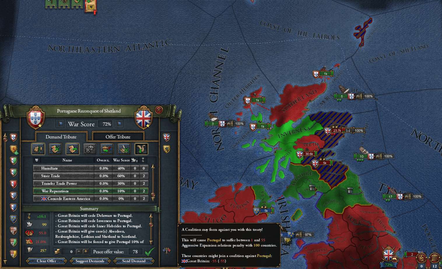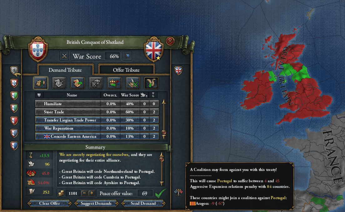 ごめんねScotland君。残念だけどPortugalの力ではSHETLANDを解放してあげられないんだ(´;ω;`) 思わぬ形で最大の懸念材料だったMANN島を獲得できた。今思えば賠償金ではなく、もう少し領土を奪っておくべきだった