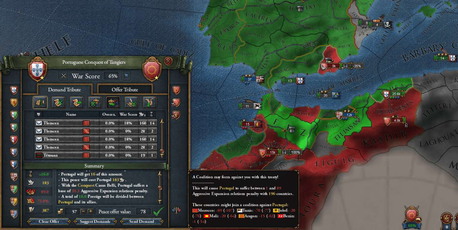 おCaさんからとったものは片方だけ(Portugalに)返してもらった イベントか何かで戦争中にSaleがMoroccoの属国として作成された。戦時中でしかも占領済みだったのに新しく国ができて驚いた