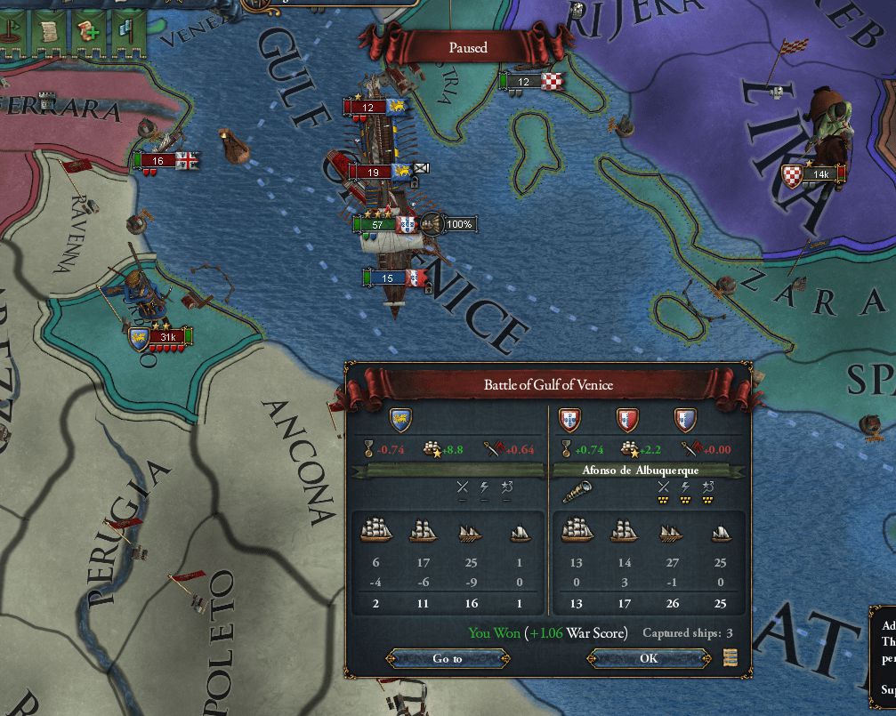 逃げ込んだ敵艦を港から追い出すため上陸を仕掛ける 結局これの繰り返しで終戦までにVenice海軍は全滅した(陸軍も大部分が傭兵だったのか、いつのまにか4kまで減っておりPortugalでも殲滅できた)