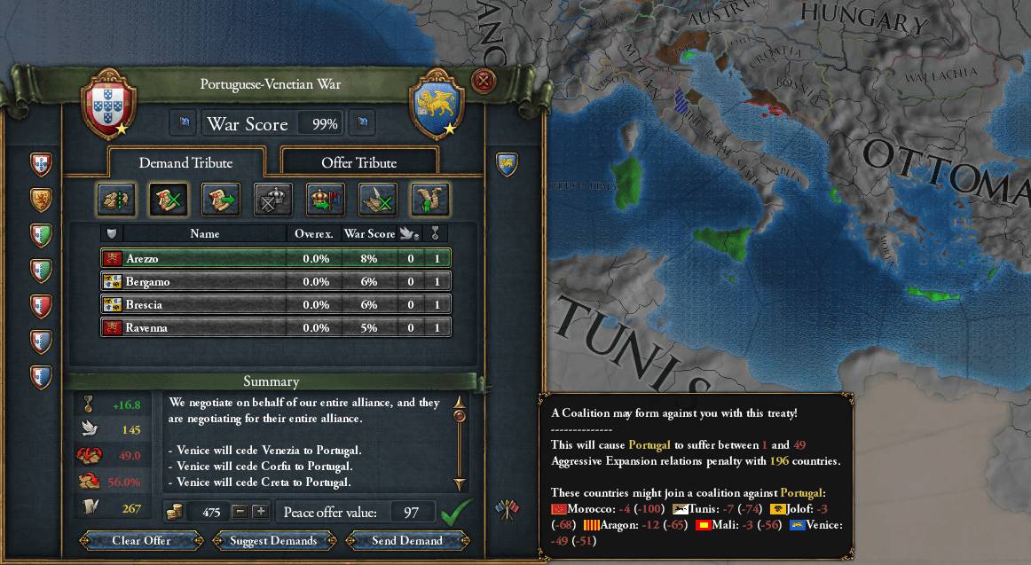 この時VeniceはURBINOも割譲させたのだが、幸いなことに31kの敵主力がそのURBINOでExile(放浪軍?黒旗状態)を解除された 当然ながらThe_Papal_StateはVeniceに通行権を与えなかったので、PortugalはのんびりVenice領の占領にあたれた 普通は逆で精強なガレー船団を保有するVeniceが制海権を握り、点在する領土を神出鬼没に移動するのだろうが、 豊富な資金力を背景に、大型船で敵を上回りガレーも敵と同程度所有していたPortugal(ついでに海軍伝統が高く指揮官も優秀)には煮え湯を飲まされた形 プレイヤーならURBINOには入らないように注意するところだが、AIにそこまでの配慮はできないらしい。Exile状態になったら最も近い領土に移動するよう設定されているのだろうか? このあたりの設定をなんとか戦略や戦術に組み込めないか、と思案しているが今回のような形で同盟国の領土を売って個別講和するくらいしか思いつかない