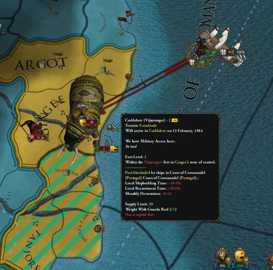 1583/10 せっかくインドまでやってきたので、ついでにVijayanagarにも宣戦布告。同盟国はなくBahmanisが独立保障していたものの、やはり借金を理由に参戦拒否