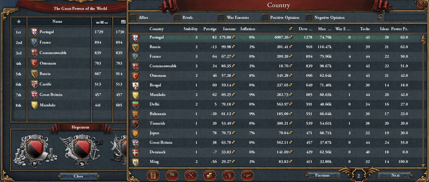 遅いのは確かだが、陸戦を避けようとすれば自ずと植民くらいに拡張手段が限られる。それも新大陸優先なので、自国のDEVはなかなか上がらなかった 既に属国を含まないPortugalのみのDEVでも世界首位であり、2~4位にFrance、Commonwealth、Russiaがひしめいていた
