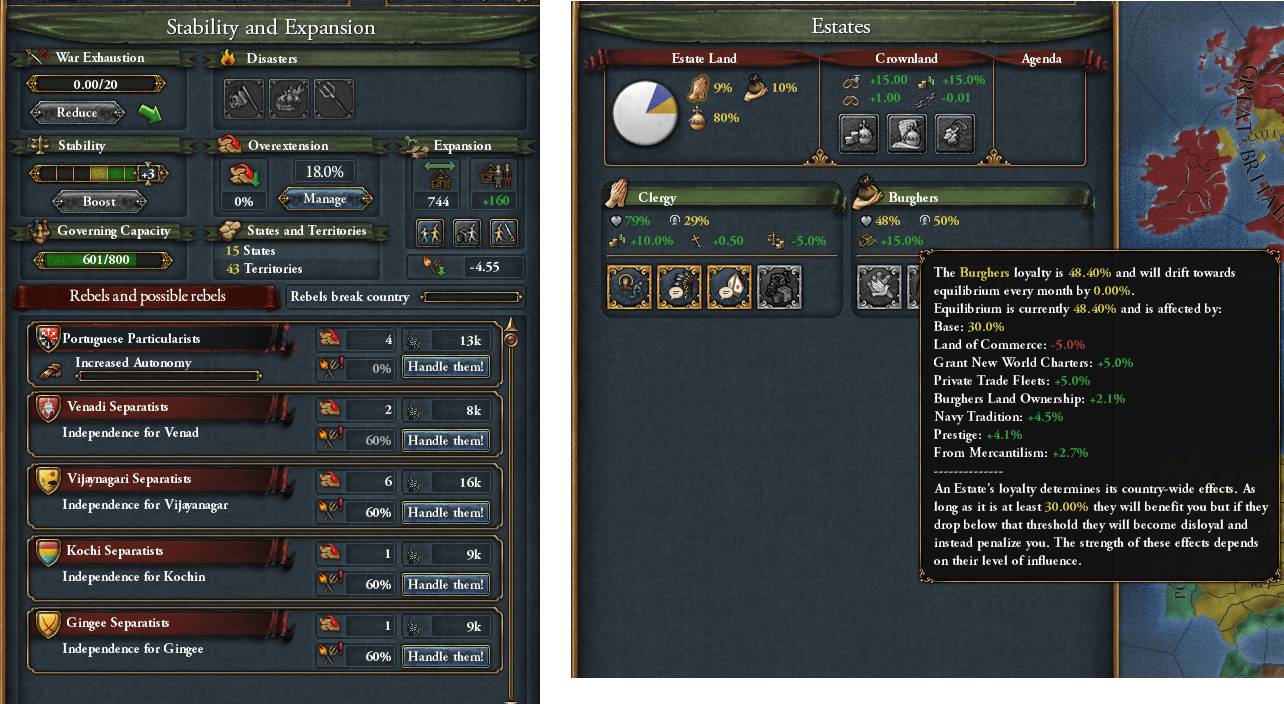 帝国ランクになり、各地に裁判所を建設したこともあって、Governing_Capacity(統治キャパシティー?)には幾分余裕がある 貴族階級が消えたことで特権の効果もなくなり、市民階級の忠誠均衡点が50%を割ってしまった Call_Dietもできなくなったので、イベントなどで忠誠度が上がった時しか領地の没収ができない 幸いParliament導入までに100%近い直轄領割合に達していたこともあって、とりあえずの目安である75%は確保できている