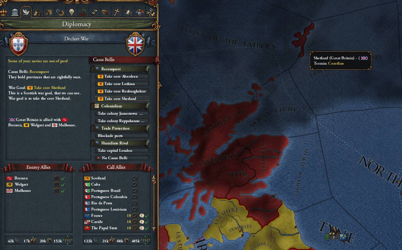 開戦時から分かっていたことだが、Scotlandの領地失陥から一定期間(50年?)が経過したため、大ブリテン島の最北部やSHETLAND以外の島嶼部にはコアが残っていなかった