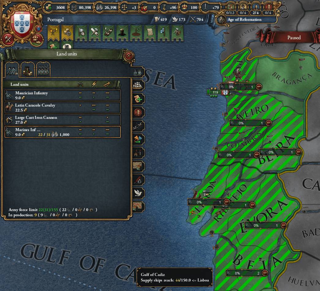 Portugalは20連隊で33位だった(陸軍扶養限界は149) 海軍は質量ともに世界一だと思う。ガレー船の数ではOttomansに劣るものの金はあるので必要なら作ればいいし、同数以上なら負けることはないと思う 陸軍なんて飾りです、偉い人にはそれが分からんのです😑
