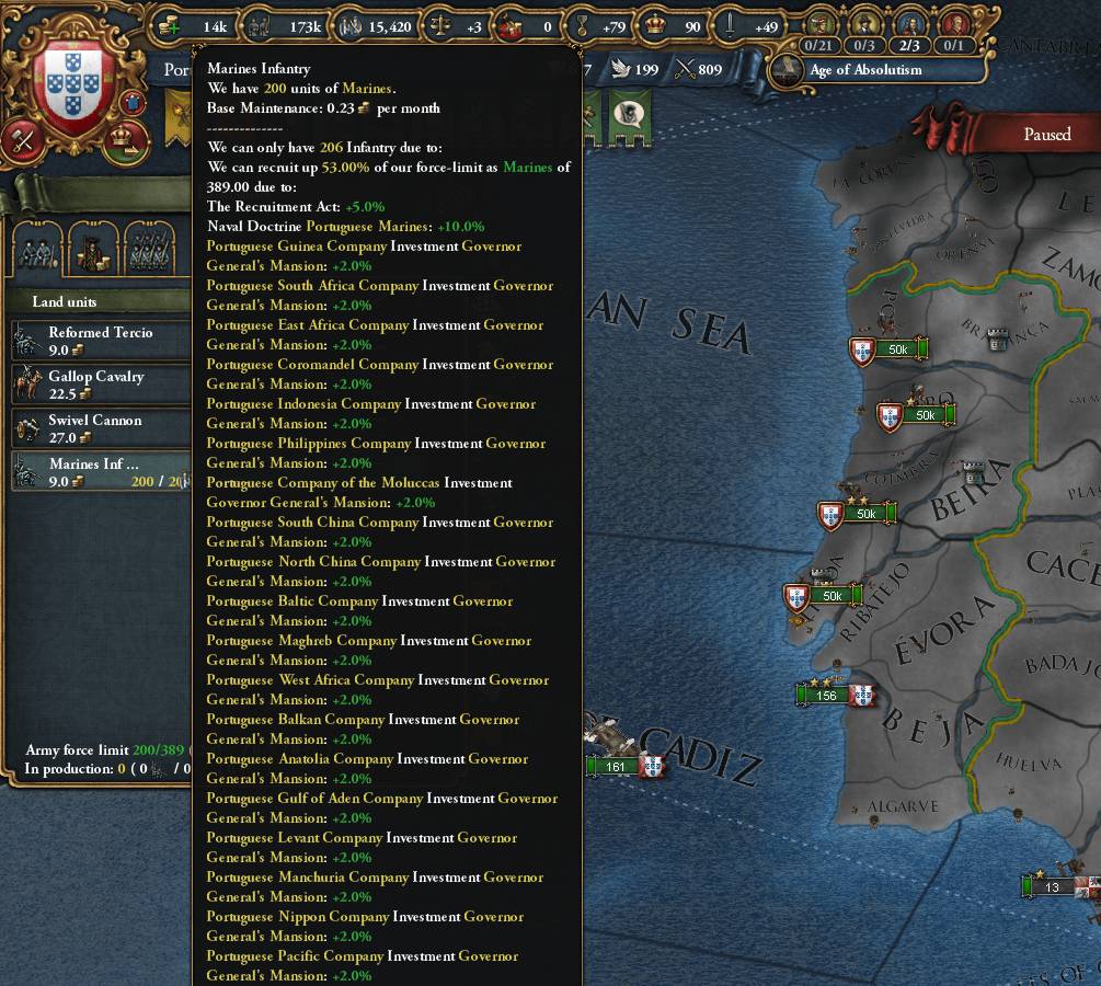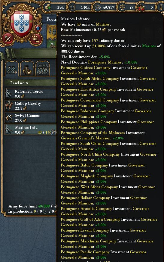 ついに海兵隊比率が50%を超えた。もう海軍アイデアの必要もない あと前話最後の陸軍扶養限界419は、ロード直後の貿易会社の自治度が0%状態でのものだったらしく、本来の65%では画像の通り陸軍扶養限界308が正しいようだ