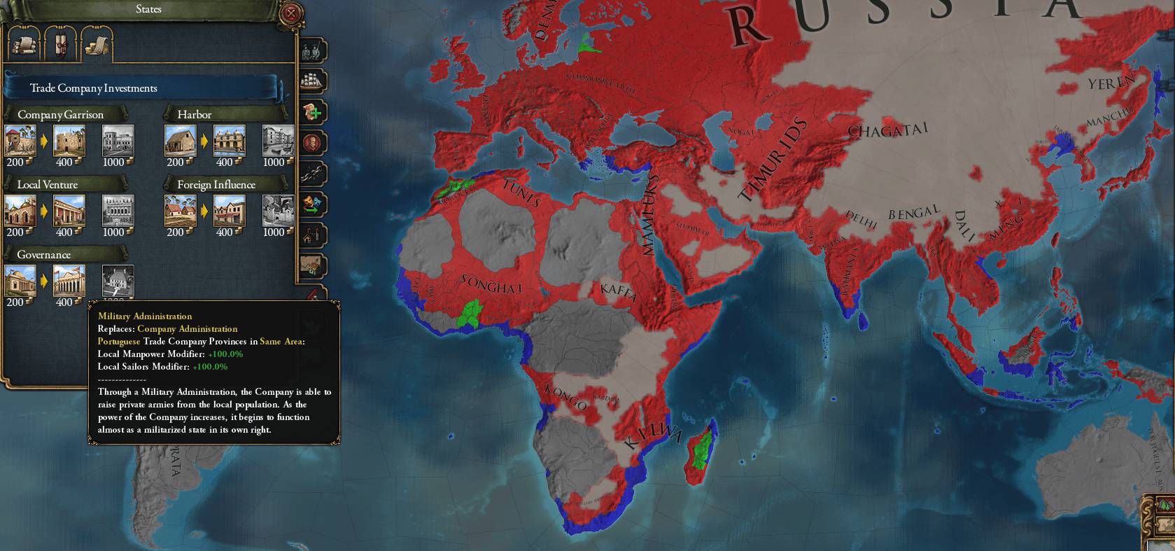 青が投資済み。人的資源はどうでもいいので、内陸部の貿易会社州には投資していない ポルトガル内陸部や植民地国家にLv6要塞を建築したのも合わせて、2万ducats以上を消費し国庫の残りは4000ducatsを切った