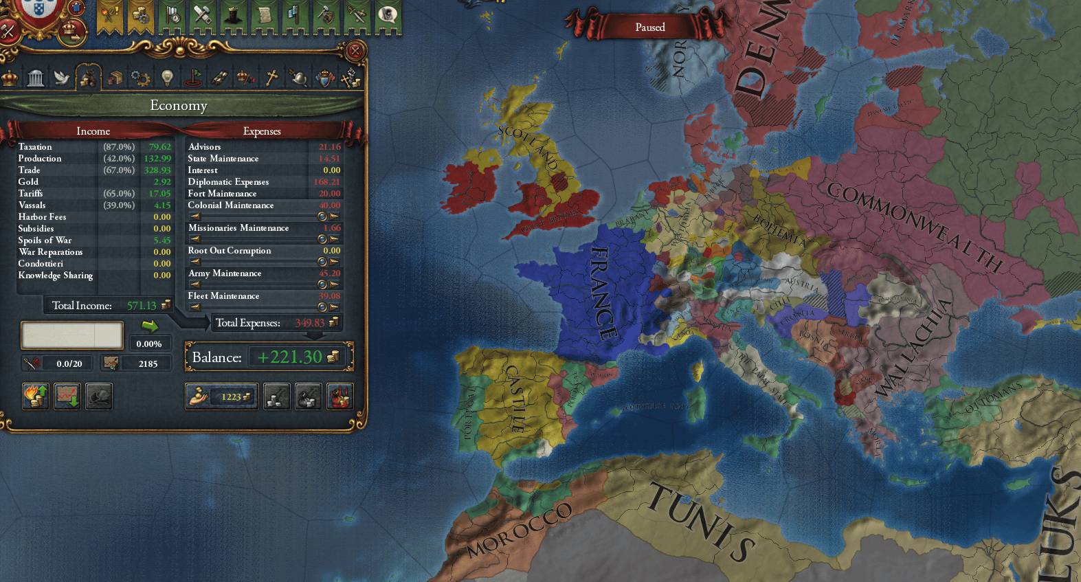 収支共に大きな変化はない Wallachiaがかなり拡大した。これもひとえにPortugalがOttomansに通行権を与えなかったおかげ、と感謝して欲しい