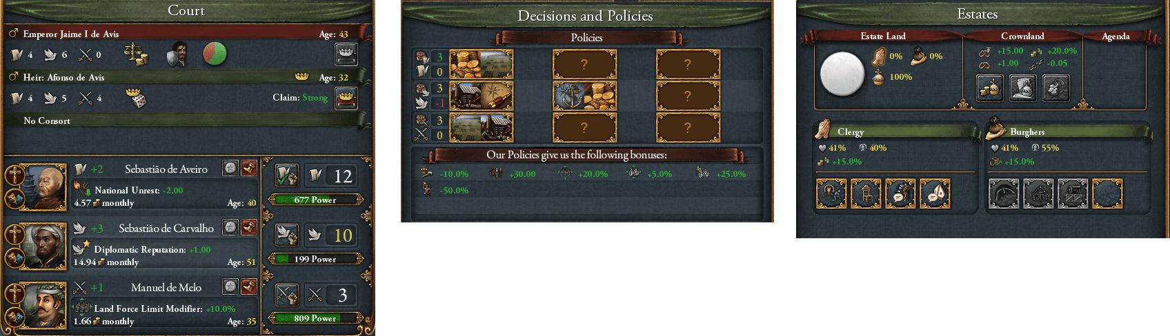 (ミッション)序盤の植民ブーストと中盤以降のGOA・MACAU関連は有用だった。他はあまり印象に残っていない (政府)結局受容文化枠を空けたままだった。こんなことなら最初のAragon戦勝利後に、受容文化に昇格しておけば良かった (属国)DEVポチのおかげもあって、軒並み忠実