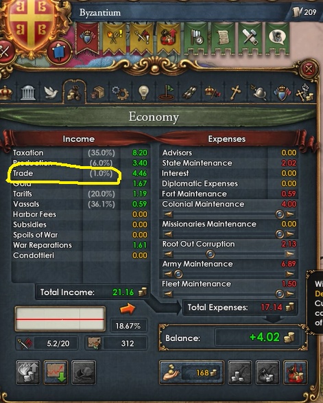 総収入は上のほうのSS*19と比較しておよそ2.5倍の52.26ダカットとなり、Army Force Limitも70まで増加。Great Powerランクは5位まで上昇し、ビザンツ陸軍の規模はフランスのそれと同じになりました。(1630年時点の話)